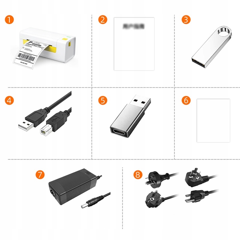 принтер етикеток, USB-флеш-накопичувач, USB-кабель, USB-C для MAC, адаптер живлення, шнур живлення, складну етикетку, посібник користувача.