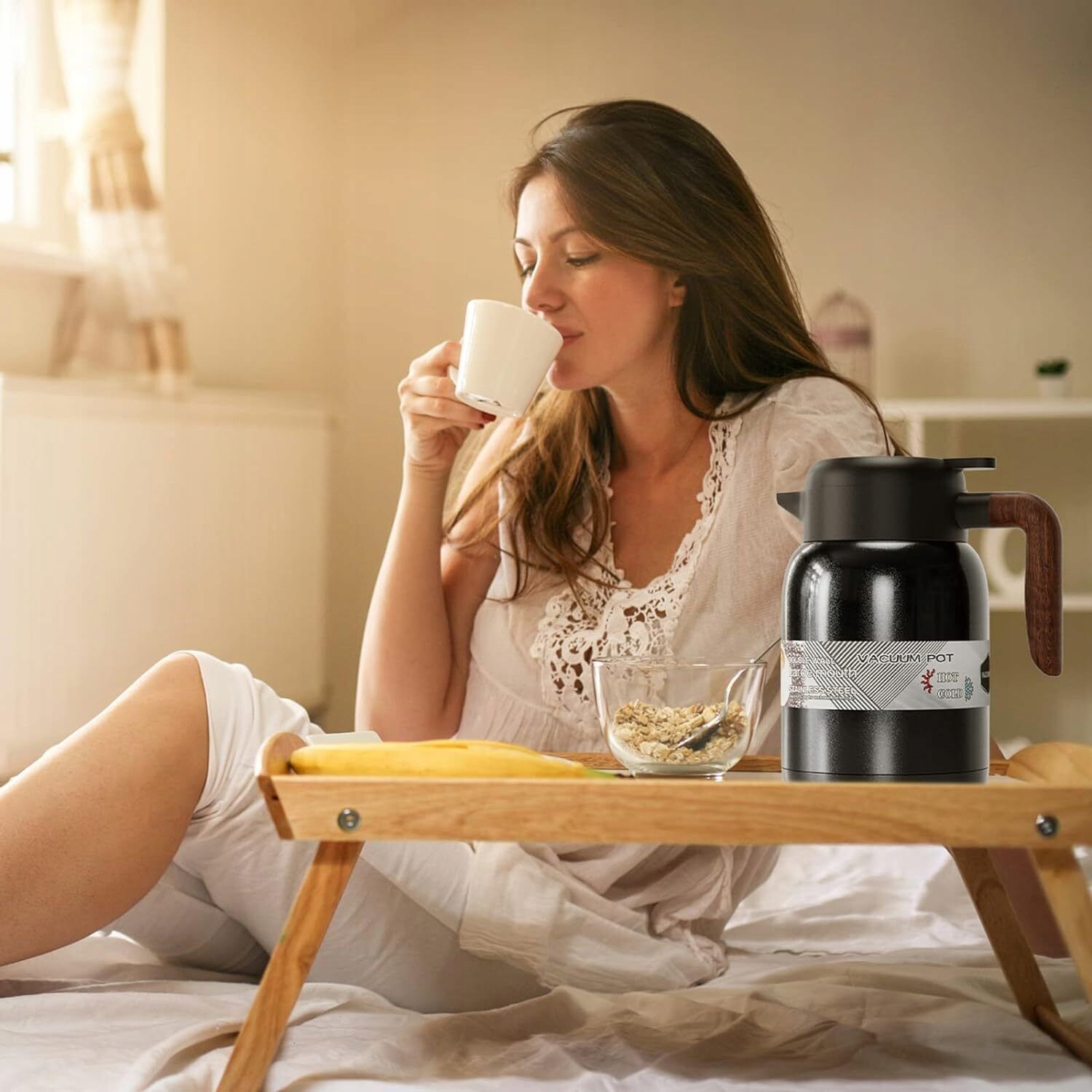 🔥 Дерев'яна ручка та керування однією рукою - Елегантна дерев'яна ручка забезпечує не тільки зручне захоплення, але й додає нотку витонченості дизайну ізольованого глечика, роблячи його естетично привабливим у будь-якій обстановці. V-подібний носик запобігає переливанню води та дозволяє їй текти по носику. Ним можна легко керувати однією рукою.