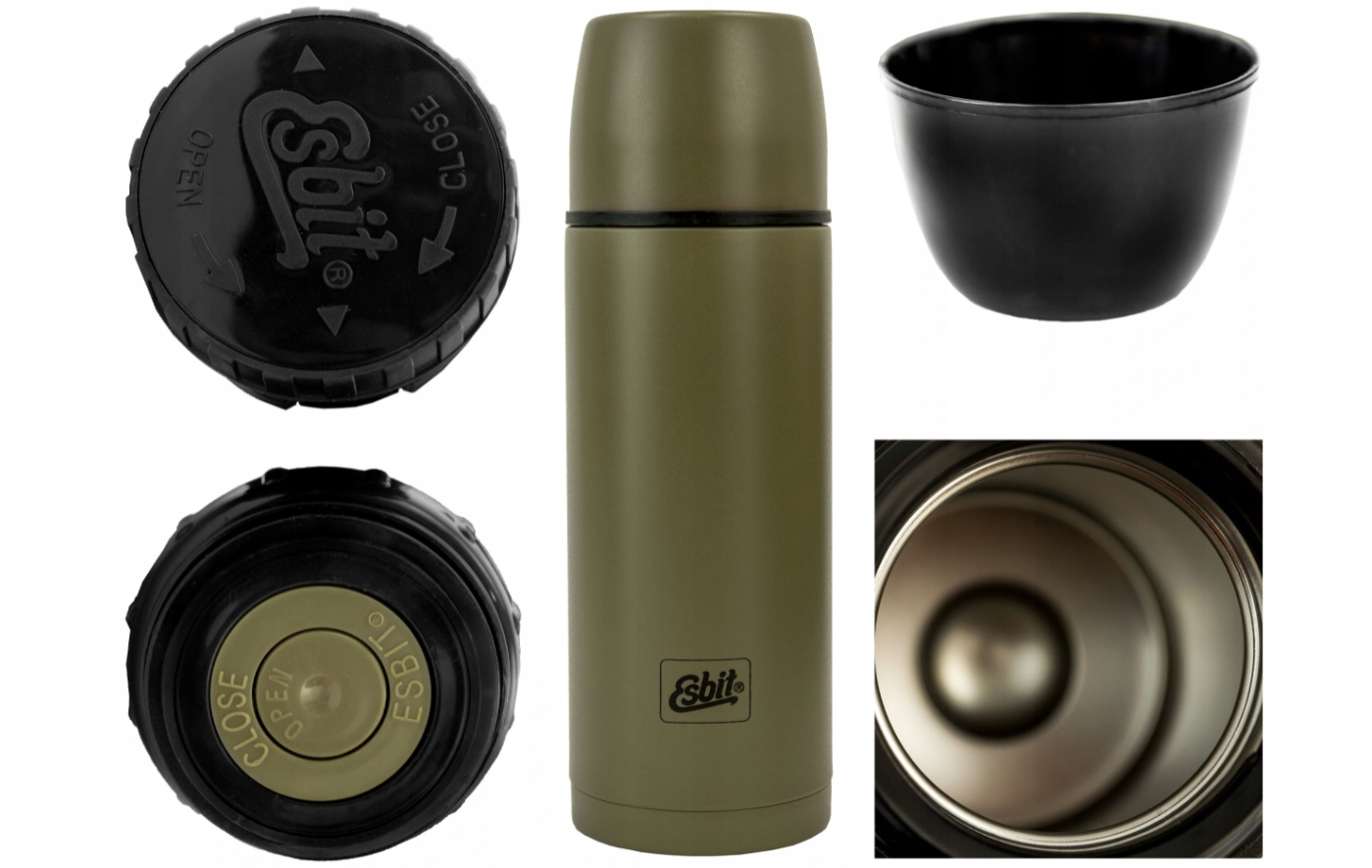 ESBIT вакуумний термос 1 л це унікальний термос із протиковзким покриттям, двома пробками та двома чашками. Оливковий колір є ідеальною пропозицією для військових, любителів виживання чи полювання.
