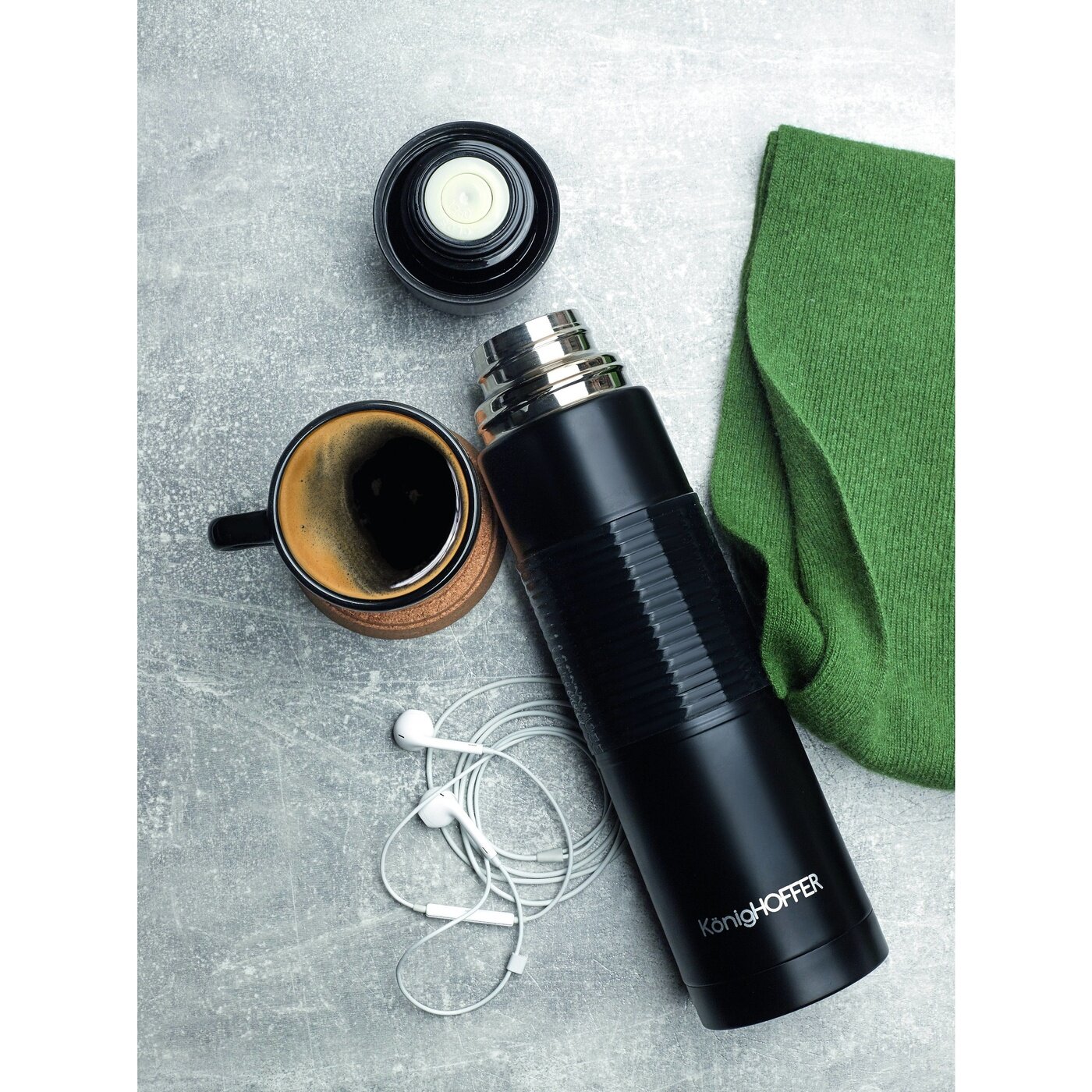 Нержавіюча кава та чай Конігффер Альфа 1 літр має силіконове накладання тіла. Це гарантує гарне зчеплення та надає комфорт у використанні. Продукт також використовує вакуумну теплоізоляцію. Завдяки подвійним стінам він добре підтримує температуру напоїв (навіть кілька годин). Чорна сталева конструкція належним чином адаптована до умов подорожей. Це також виглядає стильно. Тонка форма полегшить ставити термос у рюкзак. Система клацання клацання дозволяє не зняти з однією рукою і забезпечує точність заливання. Його шапку можна використовувати як чашку для холодних і теплих напоїв. Однак не вливайте в неї окропу.