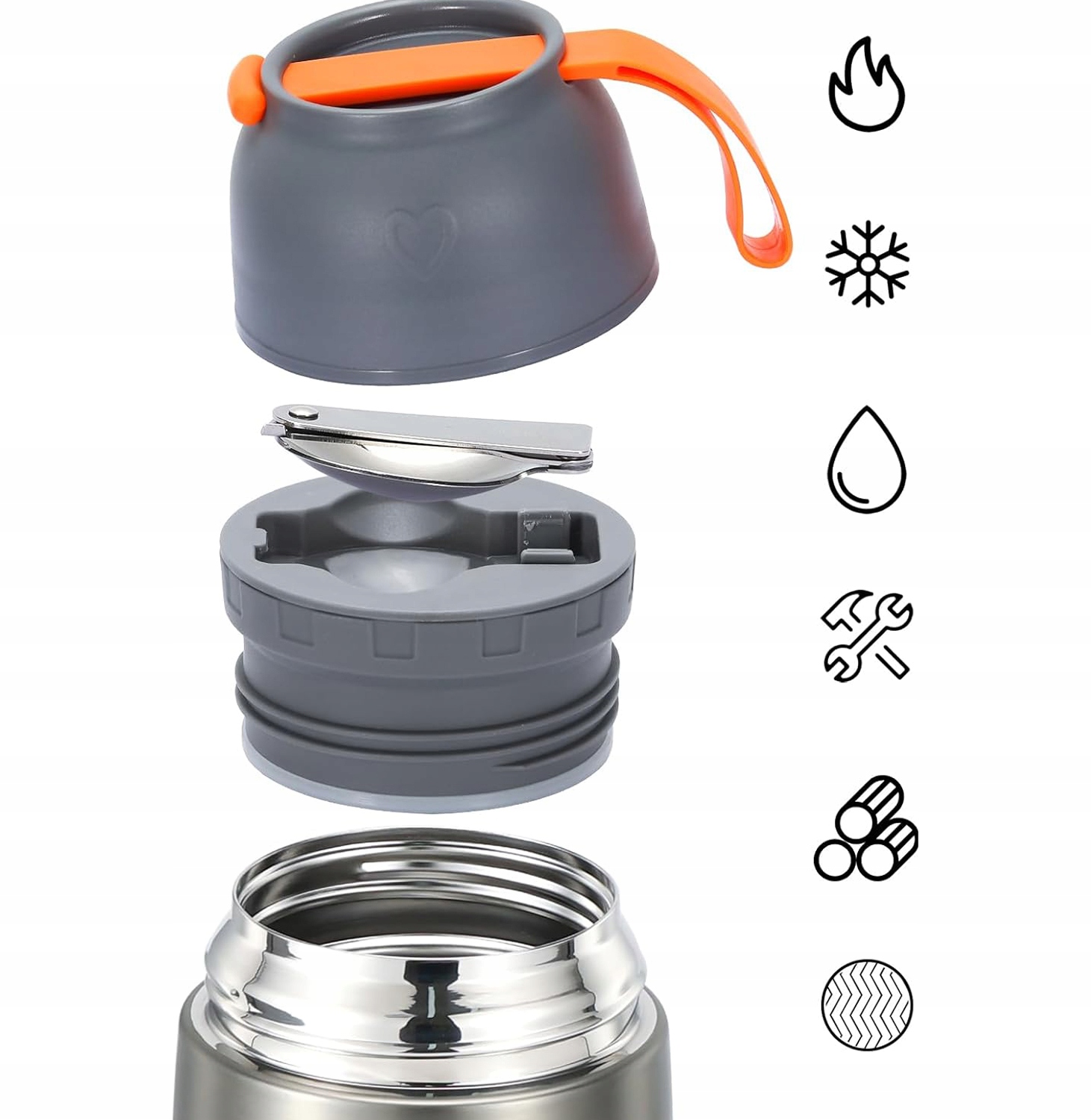 - ➖ Зовнішня кришка корисна, оскільки її можна використовувати як миску. Побудований -в складеній вилці та ложці полегшує використання. М'яка силіконова ручка, яка полегшує перенесення.