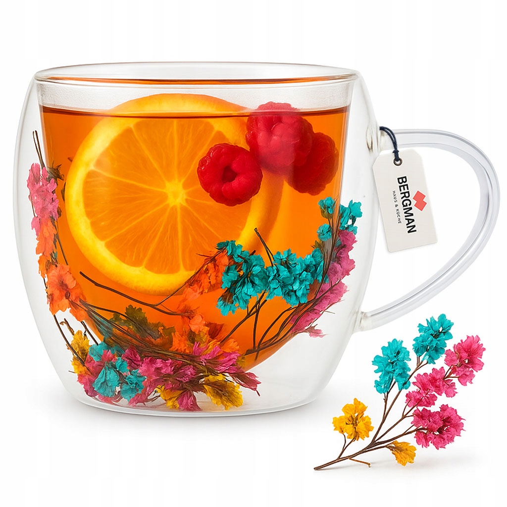 Елегантна кухоль ємністю 250 мл з високоякісного боросилікатного скла - це поєднання естетики та практичності. Подвійні стінки забезпечують чудову теплоізоляцію, а прозора структура підкреслює унікальний декоративний елемент у вигляді засушеної квітки, розміщеної всередині скла.