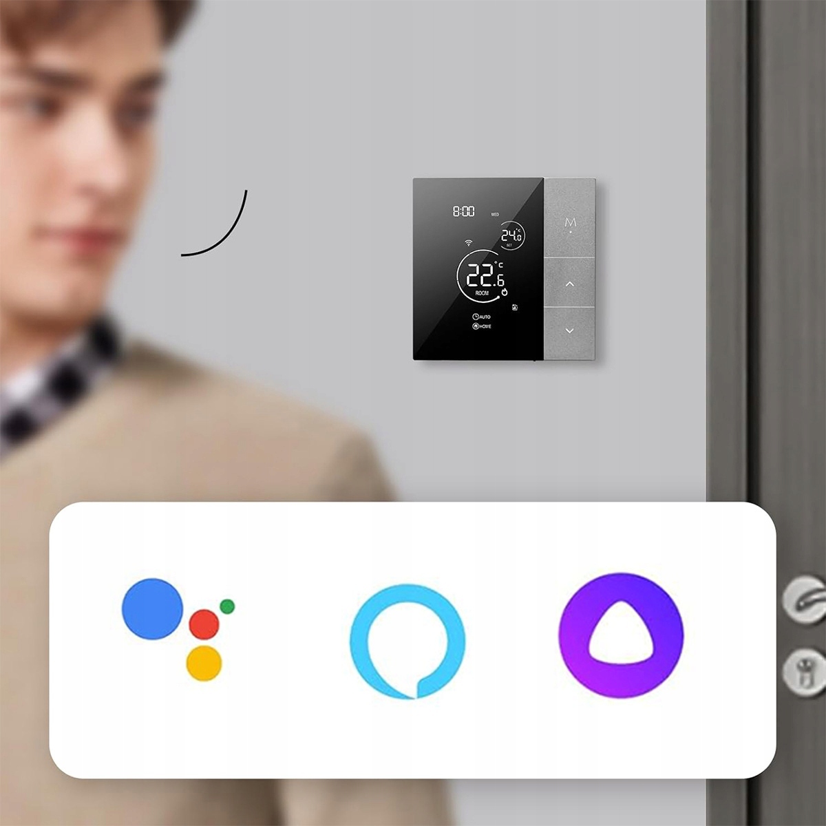 - Голосове керування без використання рук — сумісне з Amazon Alexa, Google home, Yandex Alice тощо, проста команда для керування термостатом голосом.