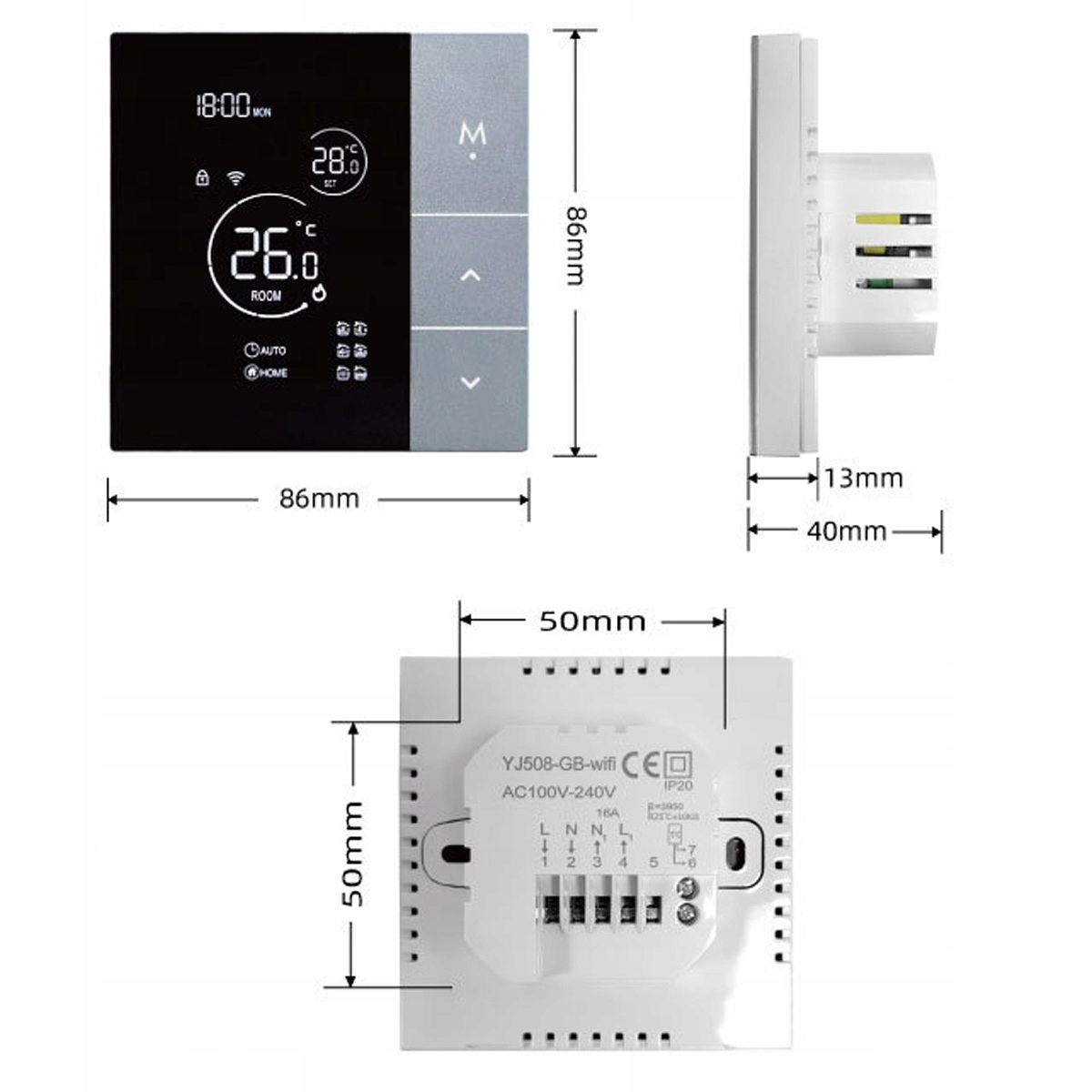 YJ508-GB-WIFI: (16 A для електричної теплої підлоги, з кабелем датчика) використовується для керування нагрівальним кабелем/нагрівальним матом/нагрівальною плівкою тощо для електричної теплої підлоги.