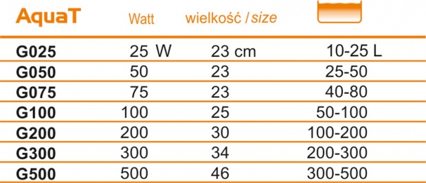 Нагрівання Вода в акваріумі, тобто постійна подача тепла, необхідна для виживання риб. Термостатні нагрівачі серії AQUA-T підтримують постійну температуру води, включаються і вимикаються автоматично, розраховані на повне занурення. Вони мають плавне регулювання, а тому високу температурну точність +- 1*C.