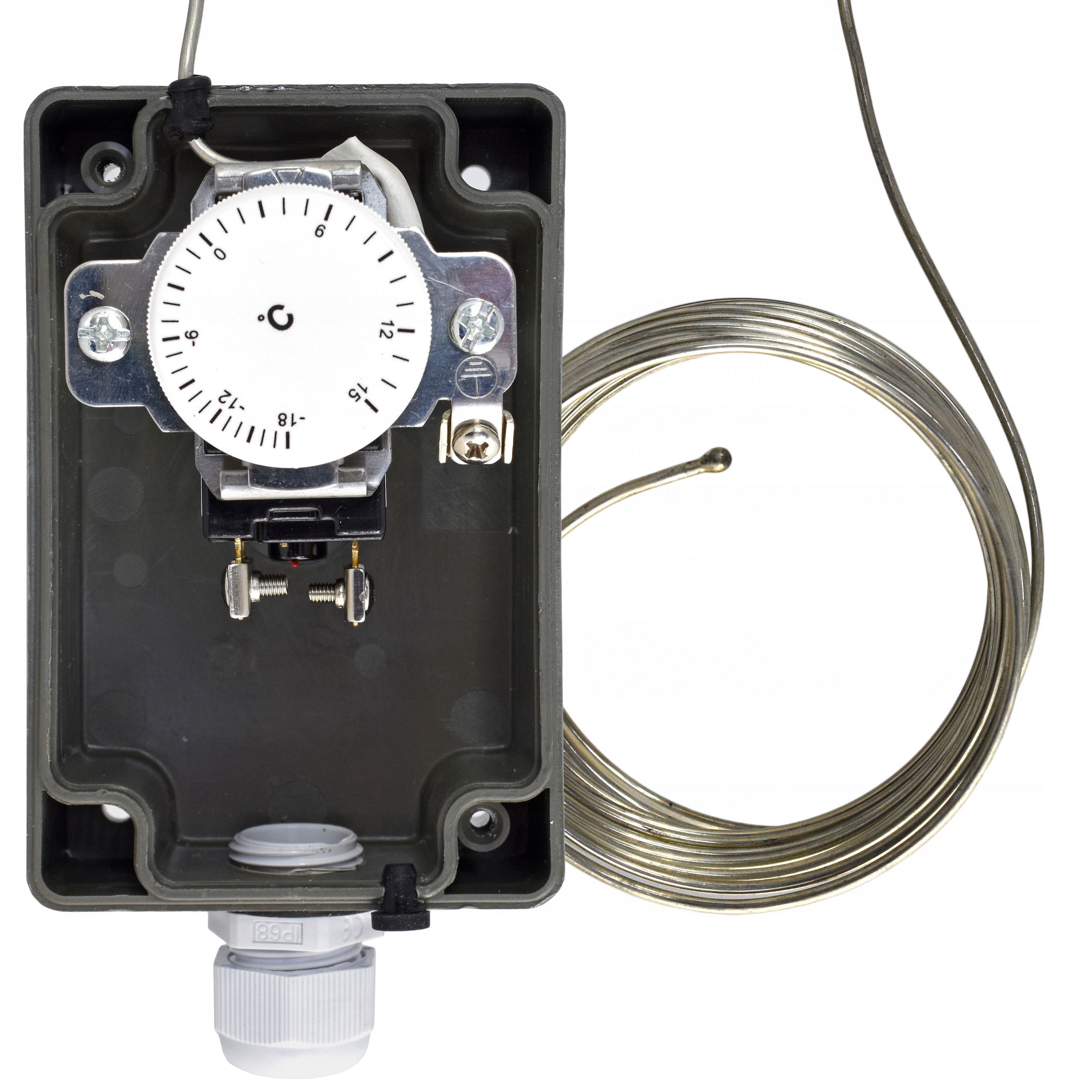 Термостат захищає від пошкоджень через замерзання обігрівачів, фільтрів і вентиляторів. Вимірювальним елементом є капіляр довжиною 2 метри. Версія 6 м доступна на інших аукціонах