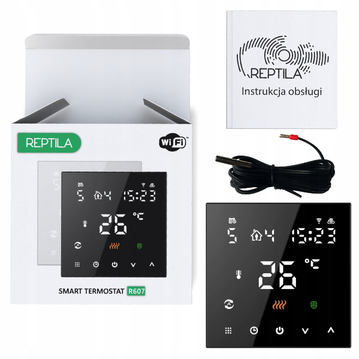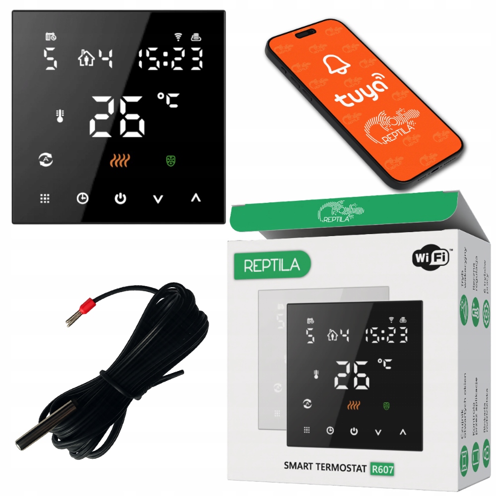 Інтелектуальний термостат Reptila R607 16A Wifi - це сучасне рішення для керування електричною теплою підлогою або нагрівальним матом. Оснащений двома датчиками температури (вбудованим і датчиком підлоги 3 м), він забезпечує точний контроль і тепловий комфорт. Він пропонує тижневе програмування, режим відпустки, функції опалення/охолодження та антифризу, а також датчик відкритого вікна для економії енергії. Він має батьківський контроль і дає змогу дистанційно керувати за допомогою програм Tuya, Smart Life, SmartThings і голосу завдяки Amazon Alexa та Google Home.
