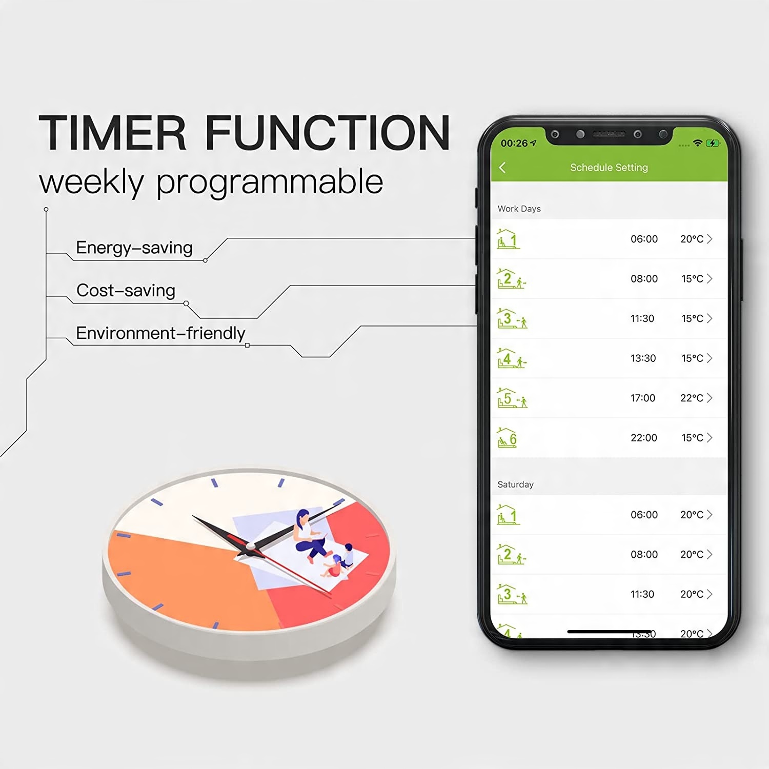 Дистанційне керування програмою для смартфона: дистанційно контролюйте температуру в домі, щоб досягти підвищеного комфорту через наш додаток MOES із необхідним концентратором, простим керуванням на смартфонах будь-де, підтримкою створення місцевих продуктів групи/частки для необмеженого централізованого контролю над кількістю продуктів/багатотермінальний контроль для справжнього інтелекту.