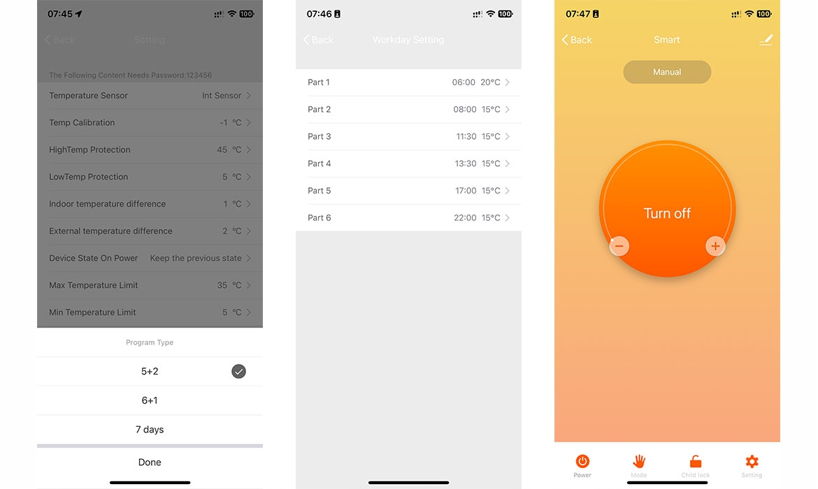 Контролер опалення дозволяє керувати за розкладом, налаштування в додатку, або за допомогою кнопок на сенсорній панелі.