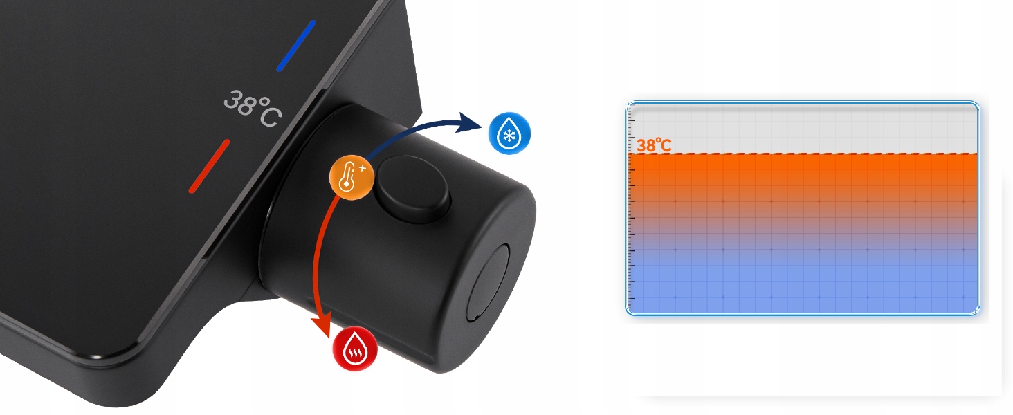 ✧ Термостатичний змішувач оснащений запобіжником на 38°C, який контролює температуру з точністю до 38°C, тому немає потреби постійно встановлювати температуру води, щоб уникнути раптового підвищення чи падіння температури.