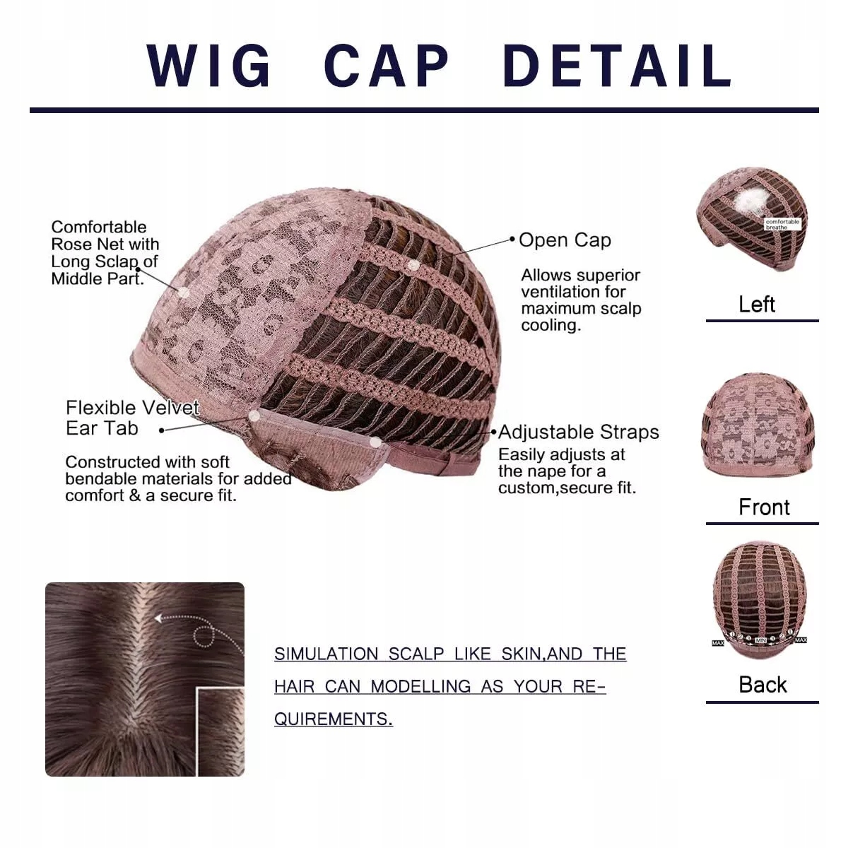 [Комфортна регульована шапочка для волосся]:дихаюча та зручна шапочка для перуки, не душна, її можна використовувати навесні, влітку, восени та взимку. Нова еластична сітка має 2 регульовані ремінці та підходить для розмірів/форм голови від 21 до 23 дюймів.