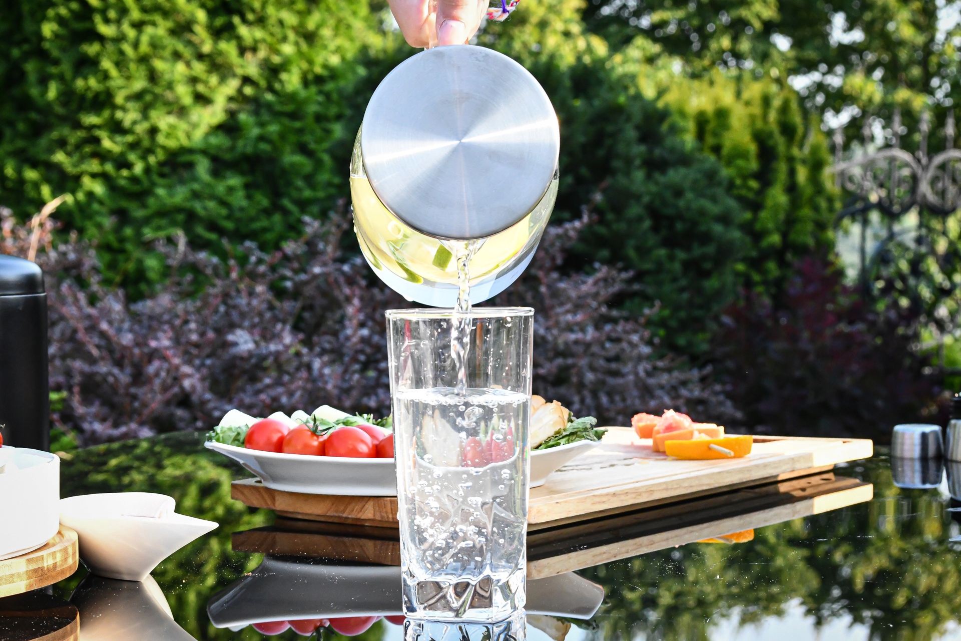 - Глечик має ситечко, яке запобігає потраплянню залишків у лимони в напій,а силіконова прокладка запобігає випаданню під час нахилу посудини.