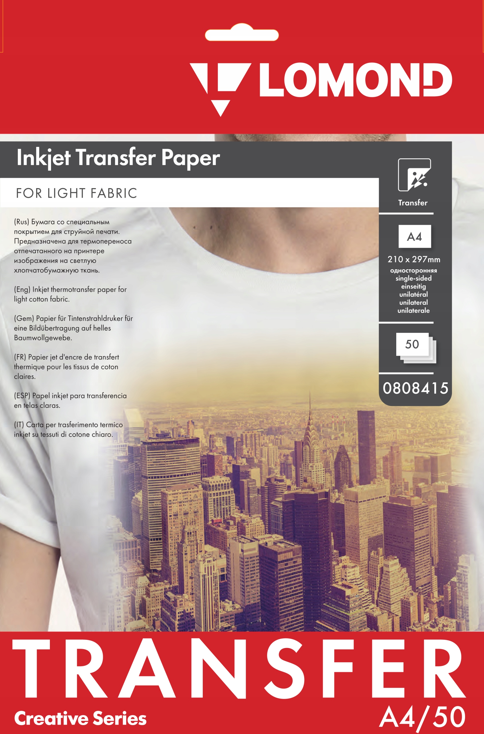 Термотрансферний папір Lomond 0808441 призначений для використання з легкими тканинами. Потрібне зображення друкується на струменевому принтері (лазерний принтер використовувати не можна), з найвищою якістю 2880 dpi, а потім надруковане зображення переноситься на сорочки (футболку) або просто на тканину за допомогою термообмінного преса. або праска.