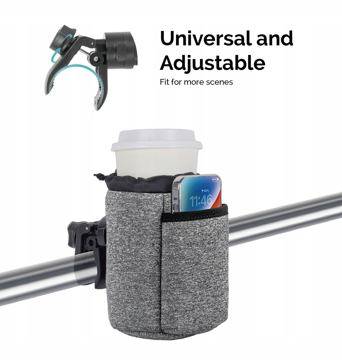 Він має універсальне кріплення до коляски або велосипедної камери, яке надійно тримає тримач на місці та легко встановлюється. Тримач універсальний: для напоїв і телефону, не тільки для коляски чи велосипедного керма, але й для інших транспортних засобів, таких як скутер чи самокат.