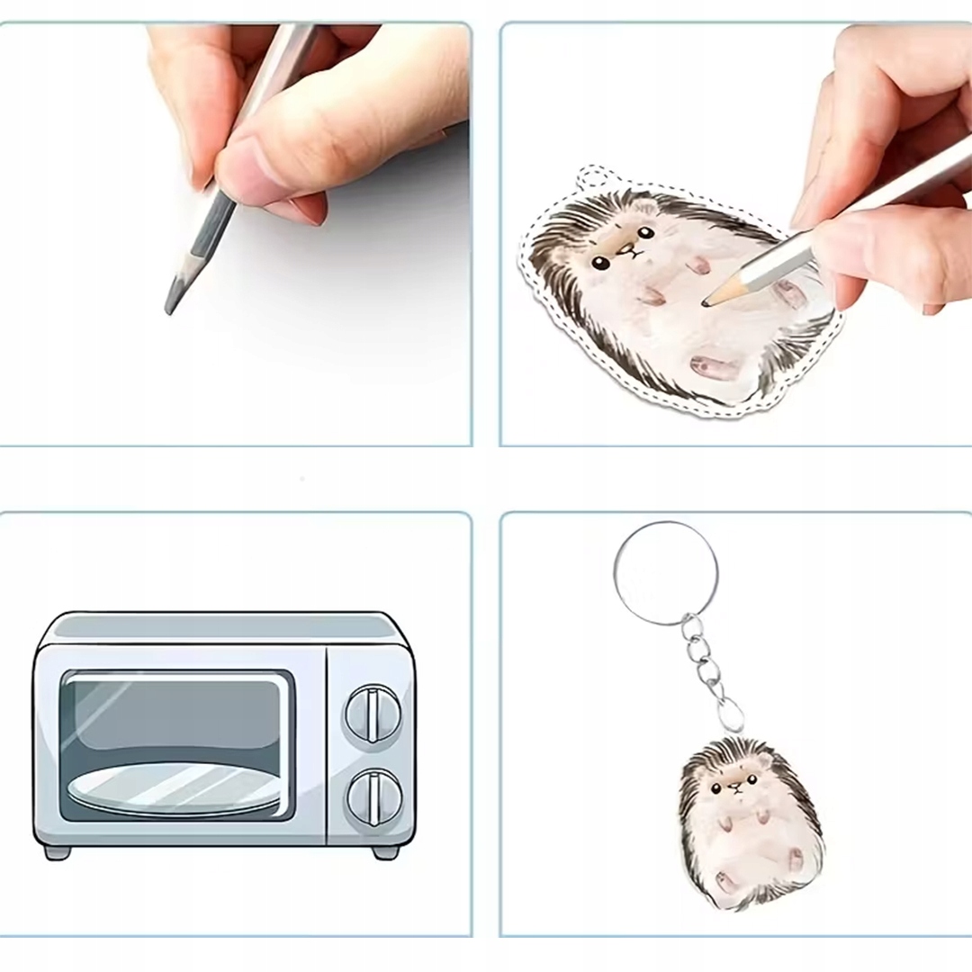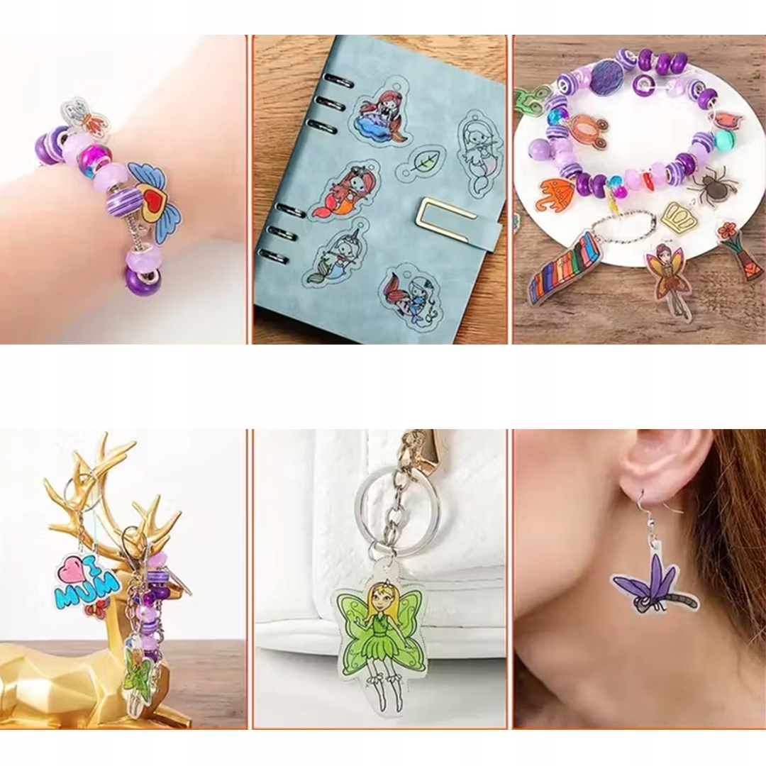 Це ідеальний спосіб створити унікальні брелоки, ювелірні вироби, підвіски та прикраси, які порадують дітей і дорослих. Просто намалюйте візерунок, розфарбуйте його, виріжте та покладіть у духовку – і за кілька хвилин фольга зменшиться та перетвориться на довговічну барвисту прикрасу.