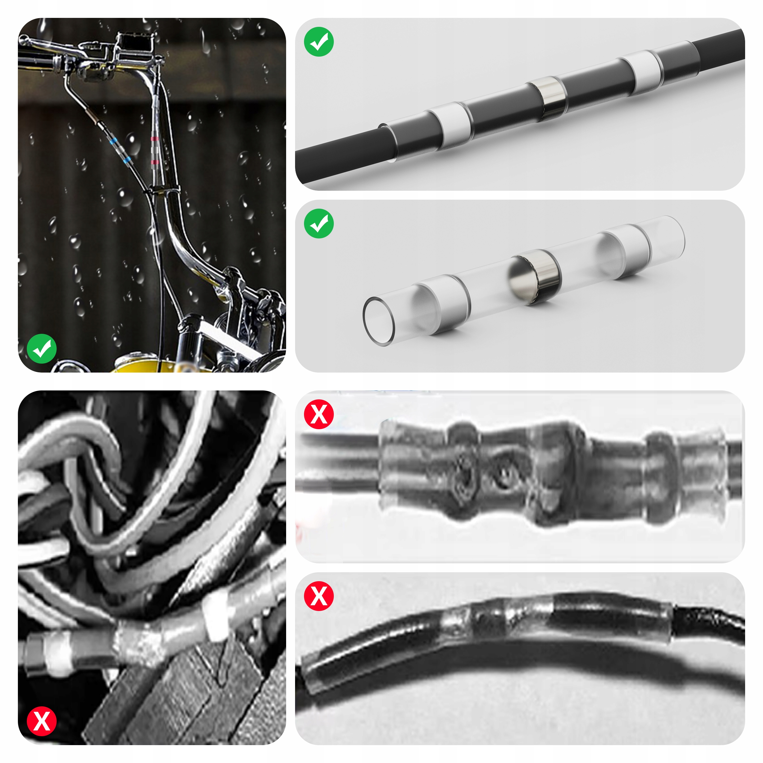- Проста операція: просто вставте 2 зачищені дроти в гільзу для припою та нагрійте їх гарячим повітрям , і ізоляційна трубка зменшуватиметься зі ступенем усадки 3:1, створюючи водонепроникне ущільнення для завершення з’єднання.