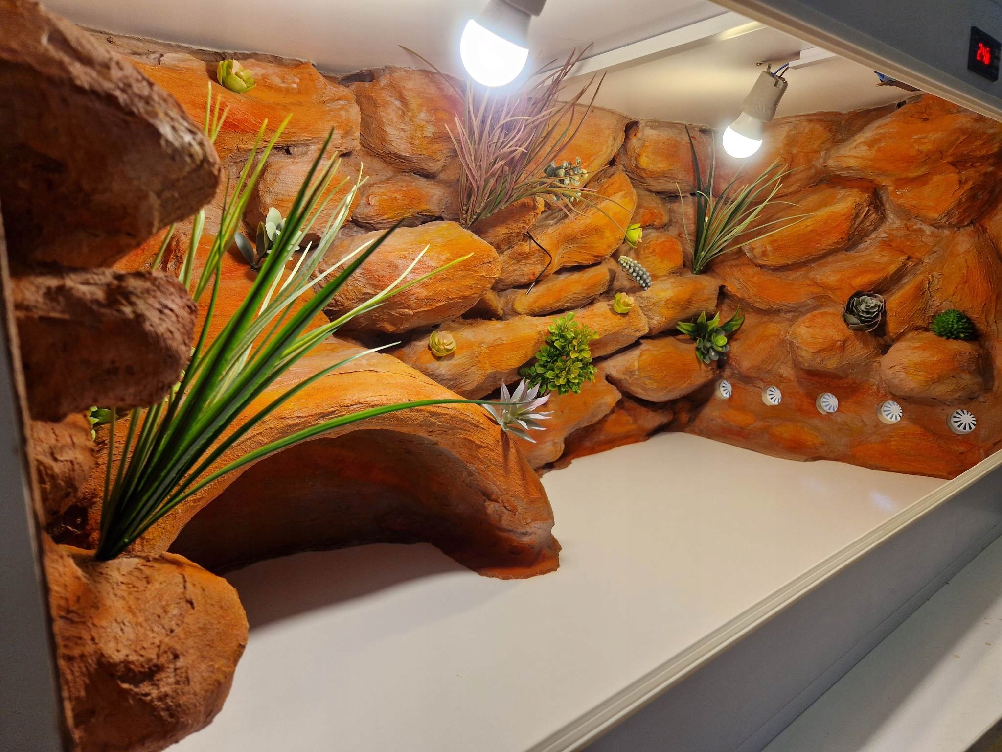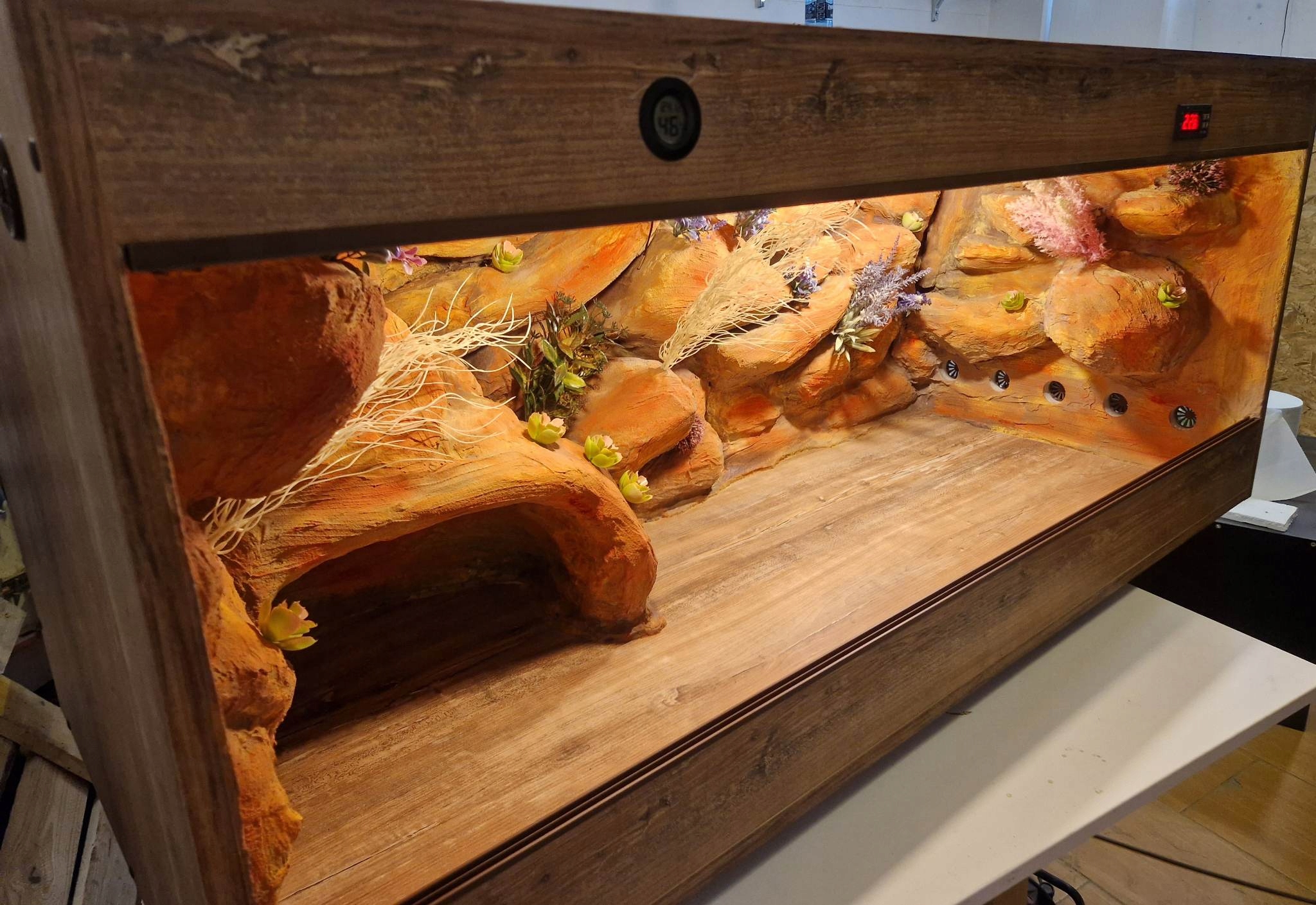 - На фотографіях представлені тераріуми, виготовлені нами на індивідуальне замовлення і можуть бути моделлю для наступних робіт. Тераріуми, які ви замовляєте, не будуть копіями представлених нижче, але вони можуть бути схожими. Ми будуємо кожен танк з нуля. Покупець може вибрати розташування каменів (якщо це можливо) і колір фону тераріуму.
