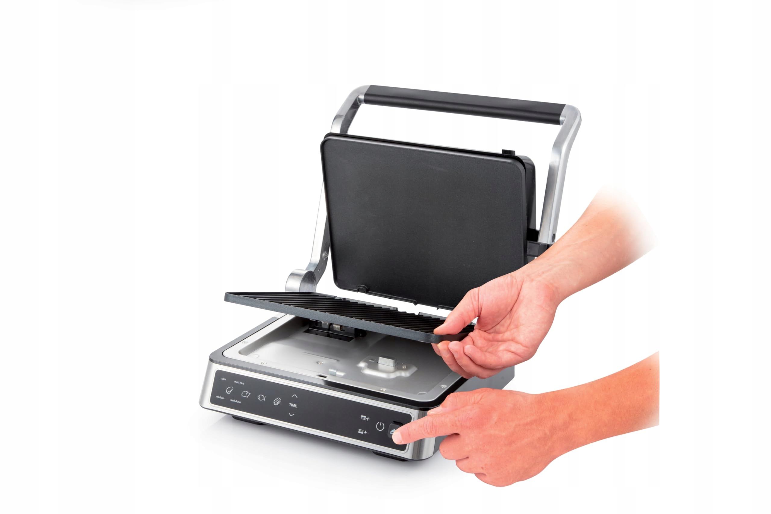 - Подвійна поверхня гриля: гладка та ребриста, обидві легко знімаються та пристосовані для швидкого очищення.