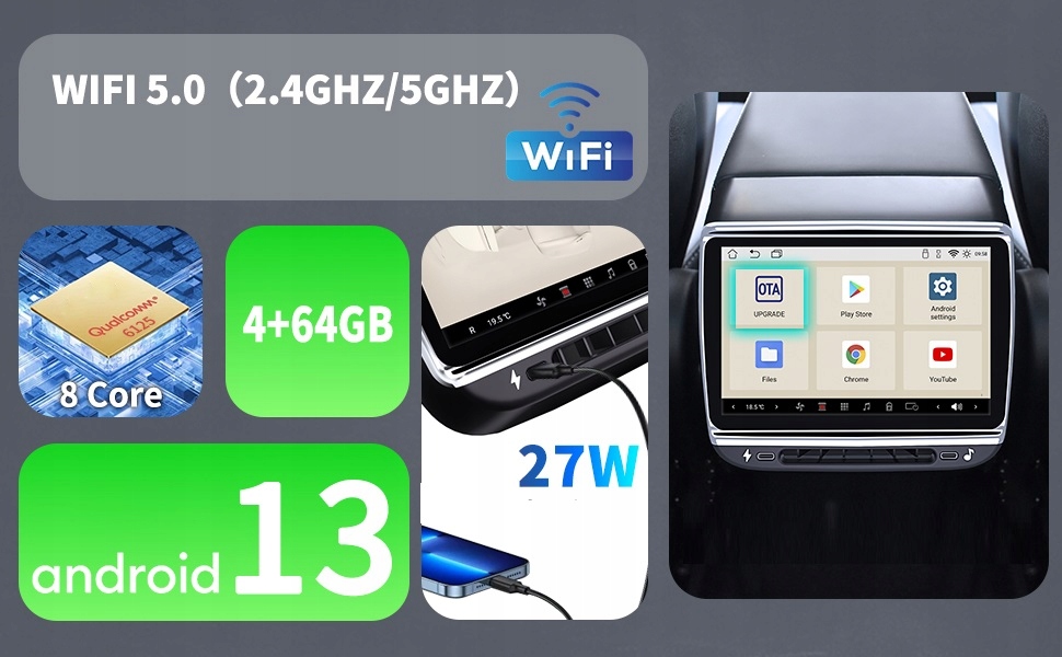 - ⋆ ✳️ Бездротовий Wi-Fi 5.0: Задня панель дисплея має бездротове підключення Wi-Fi 5.0 (2,4 ГГц/5 ГГц), операційну систему Android 13 на борту з восьмиядерним процесором Qualcomm 6125 4+64 Гб і швидким виходом USB-C 27 Вт. зарядка.