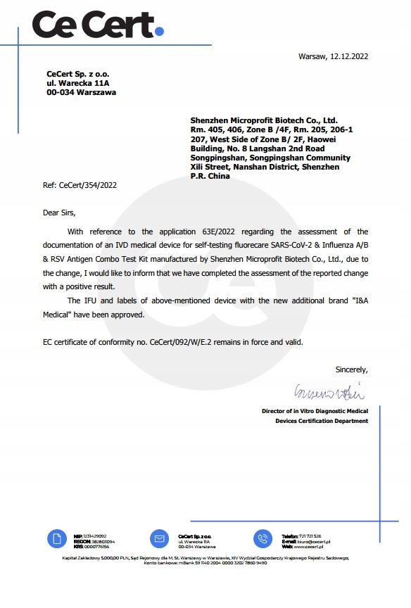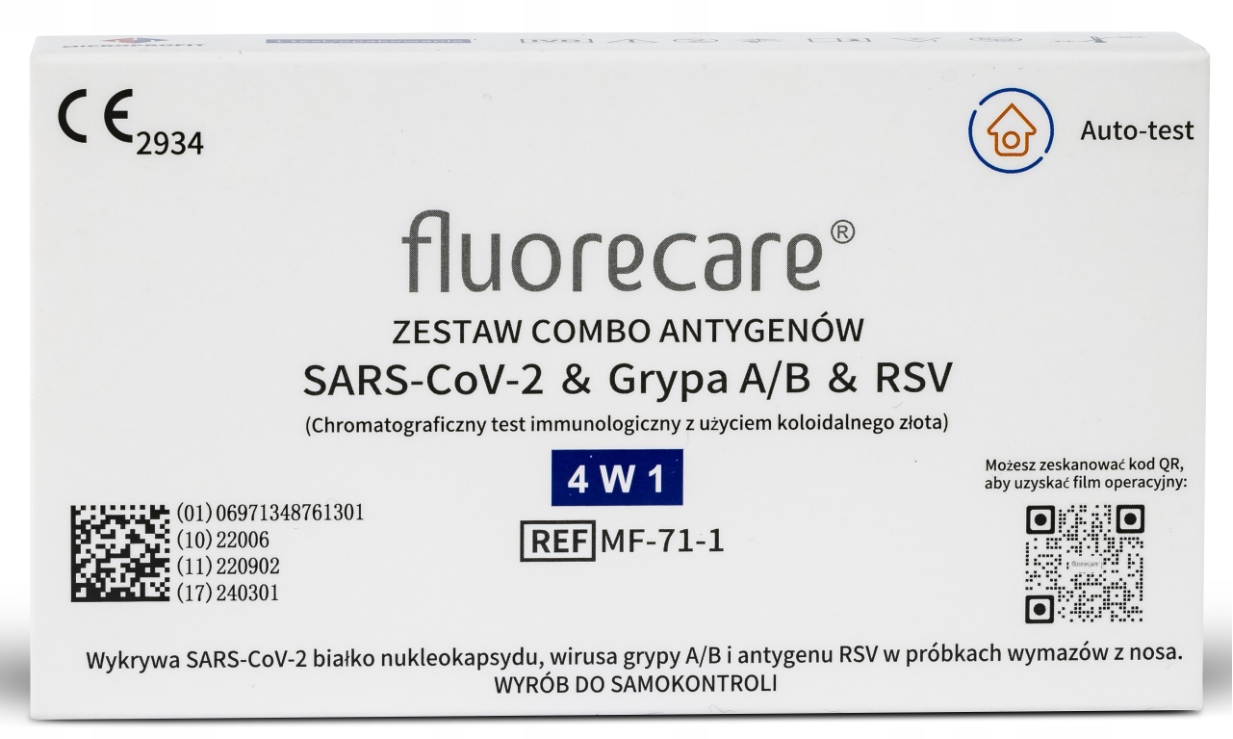 Набір Fluorecare для комбінованих тестів на наявність антигенів SARS-CoV-2 грипу A/B та RSV застосовний для одночасного якісного виявлення та диференціювання коронавірусу, антигену вірусу грипу А, антигену вірусу грипу В та/або антигену RSV у зразках мазка з носа in vitro. Його можна використовувати для діагностики інфекційних захворювань, спричинених SARS-CoV-2, у пацієнтів із симптомами протягом 7 днів після їх появи. Він також може бути використаний для допомоги в діагностиці захворювань, викликаних грипом A/B або RSV. Тільки для діагностики in vitro.