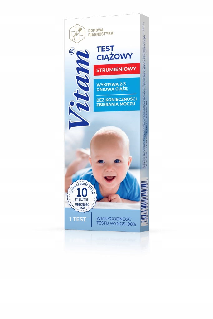 Струминний тест на вагітність Vitam - це медичний пристрій, призначений для самостійного застосування. Тест швидко дозволяє перевірити наявність хоріонічного гонадотропіну (ХГЧ) - гормону, який виробляється організмом жінки під час вагітності і виділяється з сечею. Тест дозволяє визначити наявність гормону ХГЛ в концентрації 10 мл ОД/мл, тобто вже на ранніх термінах вагітності. Цей гормон виробляється плацентою, що розвивається, незабаром після запліднення. Тест на вагітність Вітам містить антитіла, які реагують з ним. Як тільки зразок сечі поміщається на поглинаючий наконечник, гормон, що міститься в ньому, починає рухатися через мембрану. Коли hCG у зразку досягає ділянки мембрани, де відбувається реакція, з'являється кольорова лінія. Його відсутність у тестовій зоні (Т) свідчить про негативний результат тесту. У рамках процедури контролю, якщо тест було виконано правильно, у контрольній зоні тесту (C) з’явиться кольорова лінія.