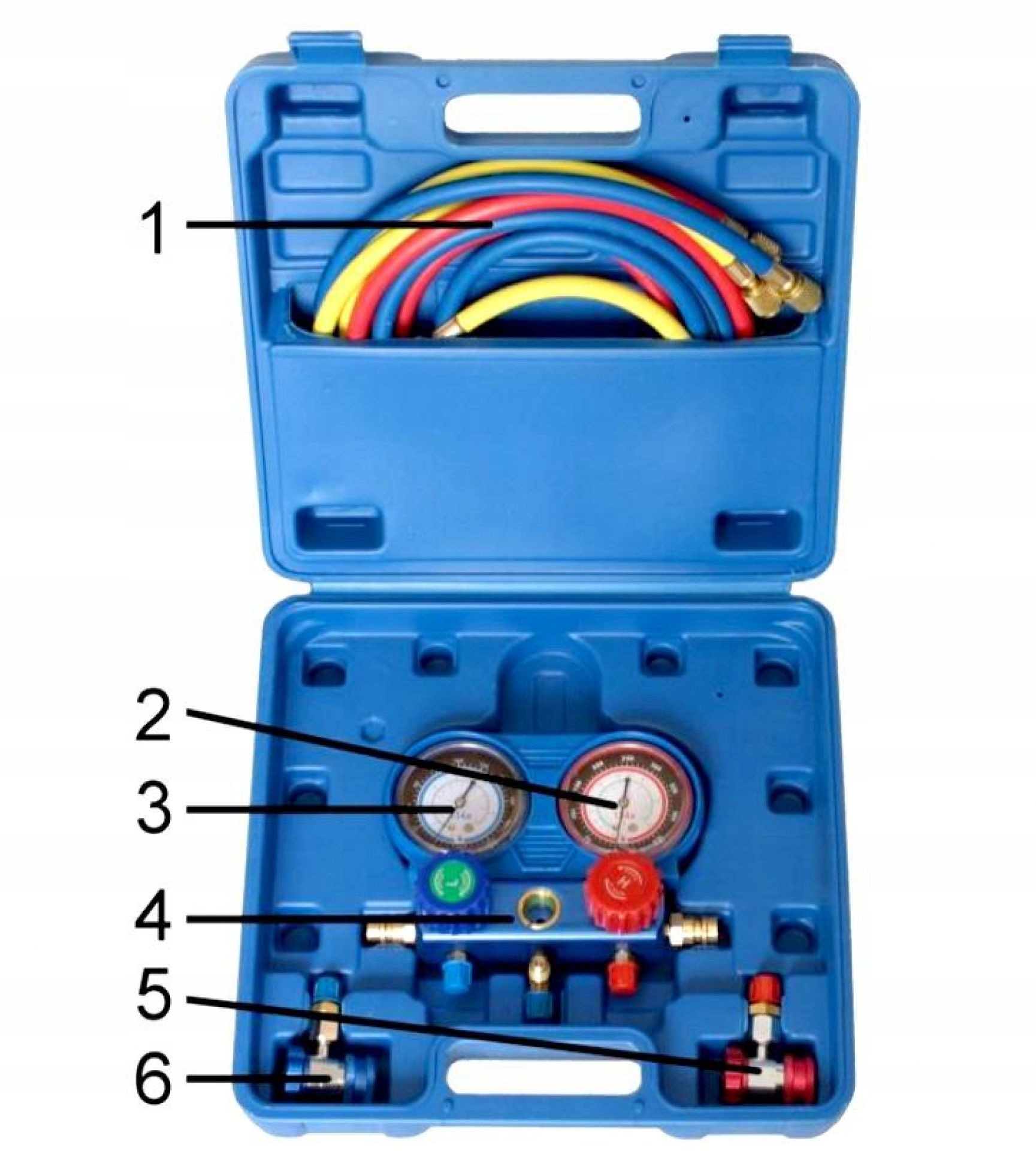 Для поводження з фактором R-134A, набір включає: подвійний клапанний блок із прицілом, манометром низького тиску (0-120psi 1-8,5 кг/см), вимірювальним тиском високого тиску (0-500psi 0-35kg /см), 3 шт. 1,5 м шланг, служба кондиціонування низького та високого тиску.