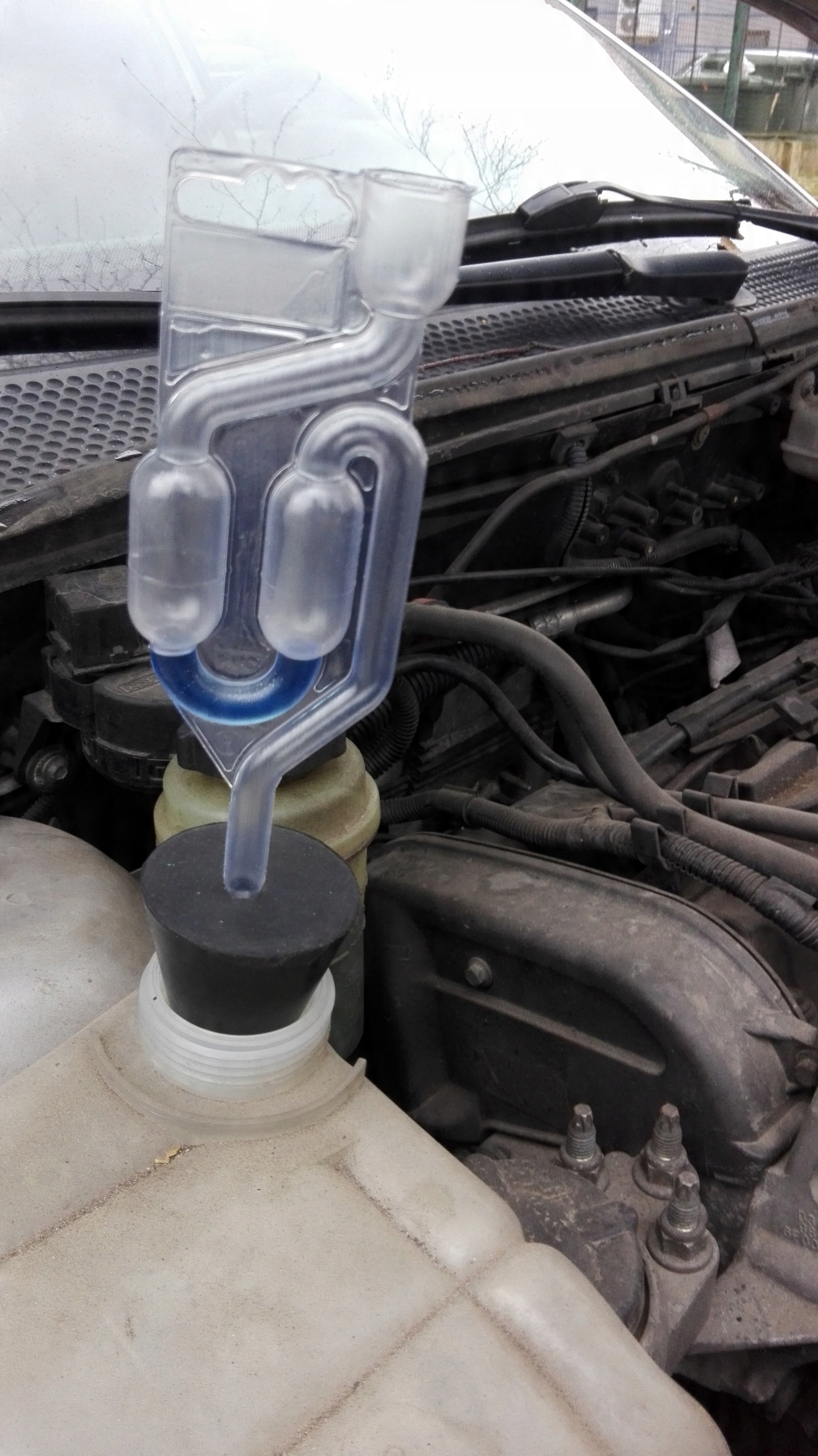Пристрій дозволяє легко діагностувати та швидко виявити пошкодження прокладки головки. У разі пошкодження прокладки головки або самої головки частина вихлопних газів. містить, серед іншого, CO2 йде в систему охолодження. Принцип роботи приладу заснований на вимірюванні вмісту CO2 в системі охолодження. Реакційна рідина в камері тестера вступить в реакцію з газами системи охолодження і, у разі підвищеного вмісту CO2, змінить колір на жовтий, безбарвний або зелений.