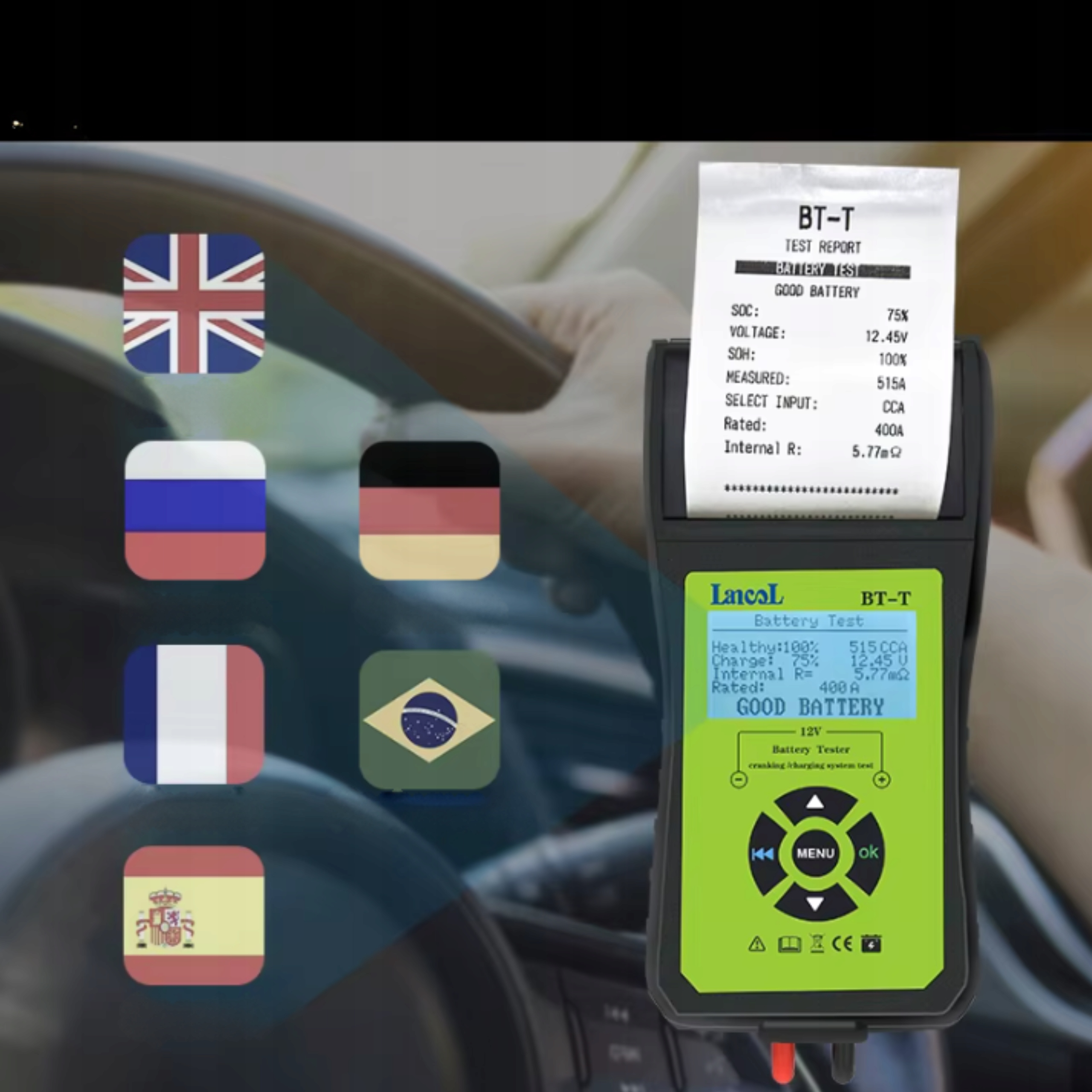 - ✔ Широкий діапазон випробувань – Аналізує напругу (7-30 В), ємність (30-200 Ач) і CCA (100-2000), стандарти BCI, CA, MCA, JIS, DIN, IEC, EN, SAE та GB.