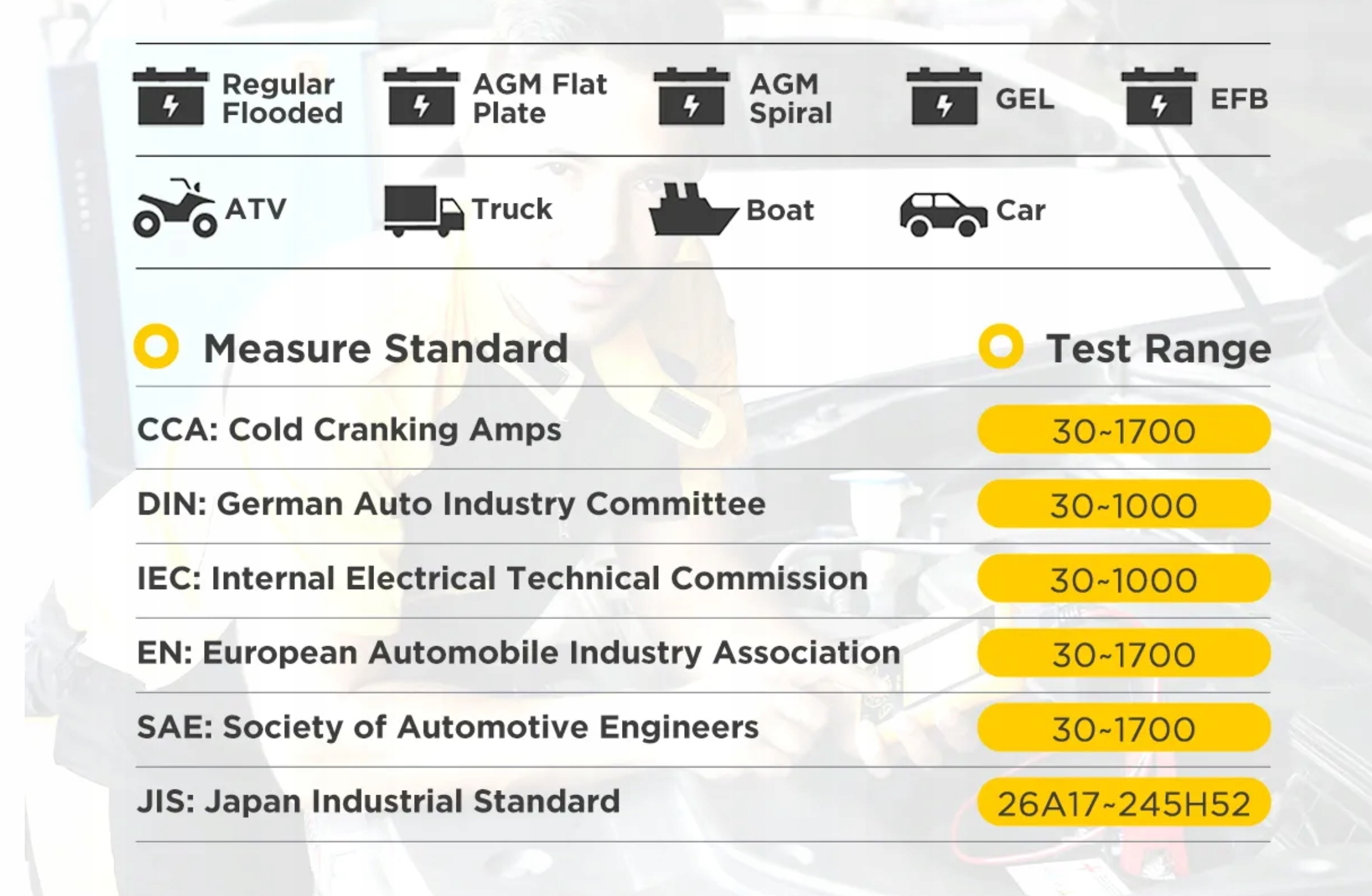 5. Стандарти тестування наразі охоплюють більшість світових стандартів акумуляторів, CCA, JIS, DIN, IEC, EN, GB.