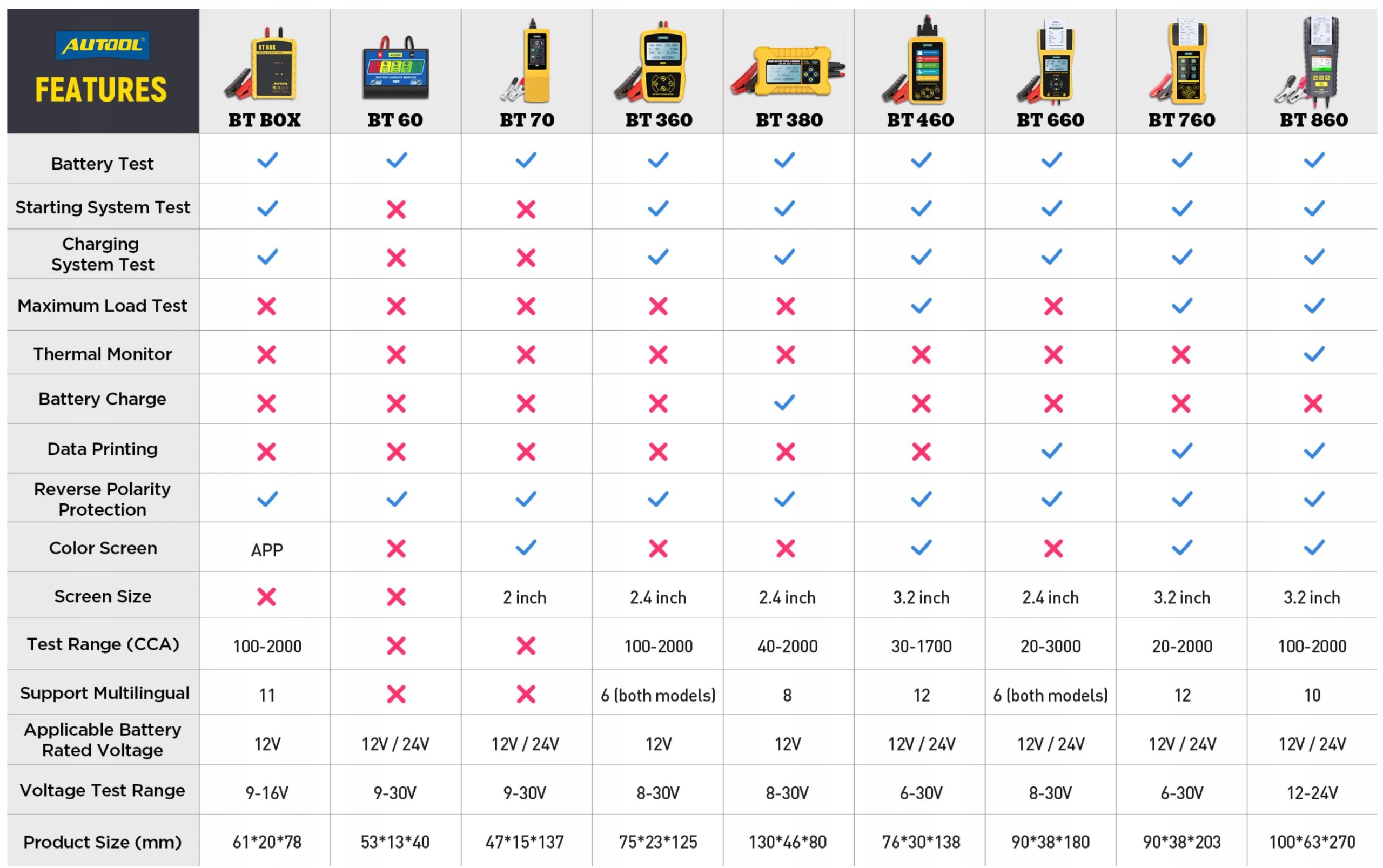 1. Перевірте всі автомобільні (включаючи 12 В автомобілів і 24 В важких вантажівок) свинцево-кислотні стартерні батареї, включаючи звичайні свинцево-кислотні батареї, плоскі батареї AGM, спіральні батареї AGM і гелеві батареї тощо.