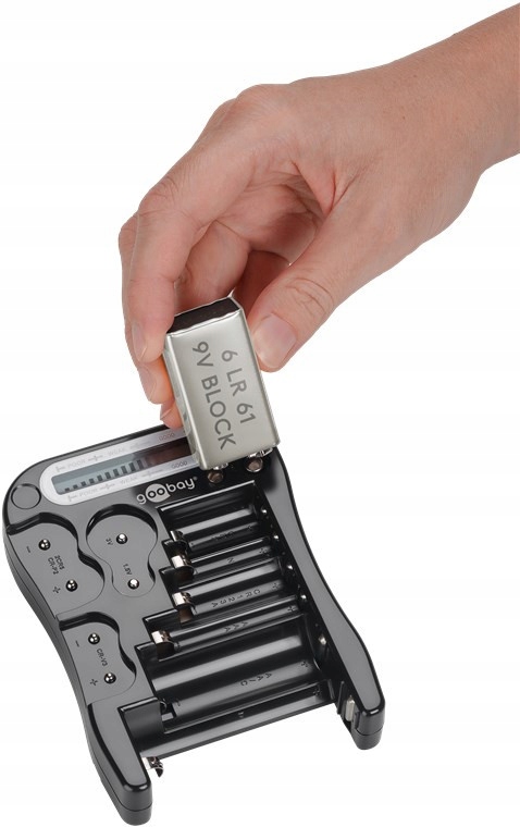 - Простий у використанні тестер акумулятора Goobay для перевірки стану заряду багатьох популярних батарей і акумуляторів