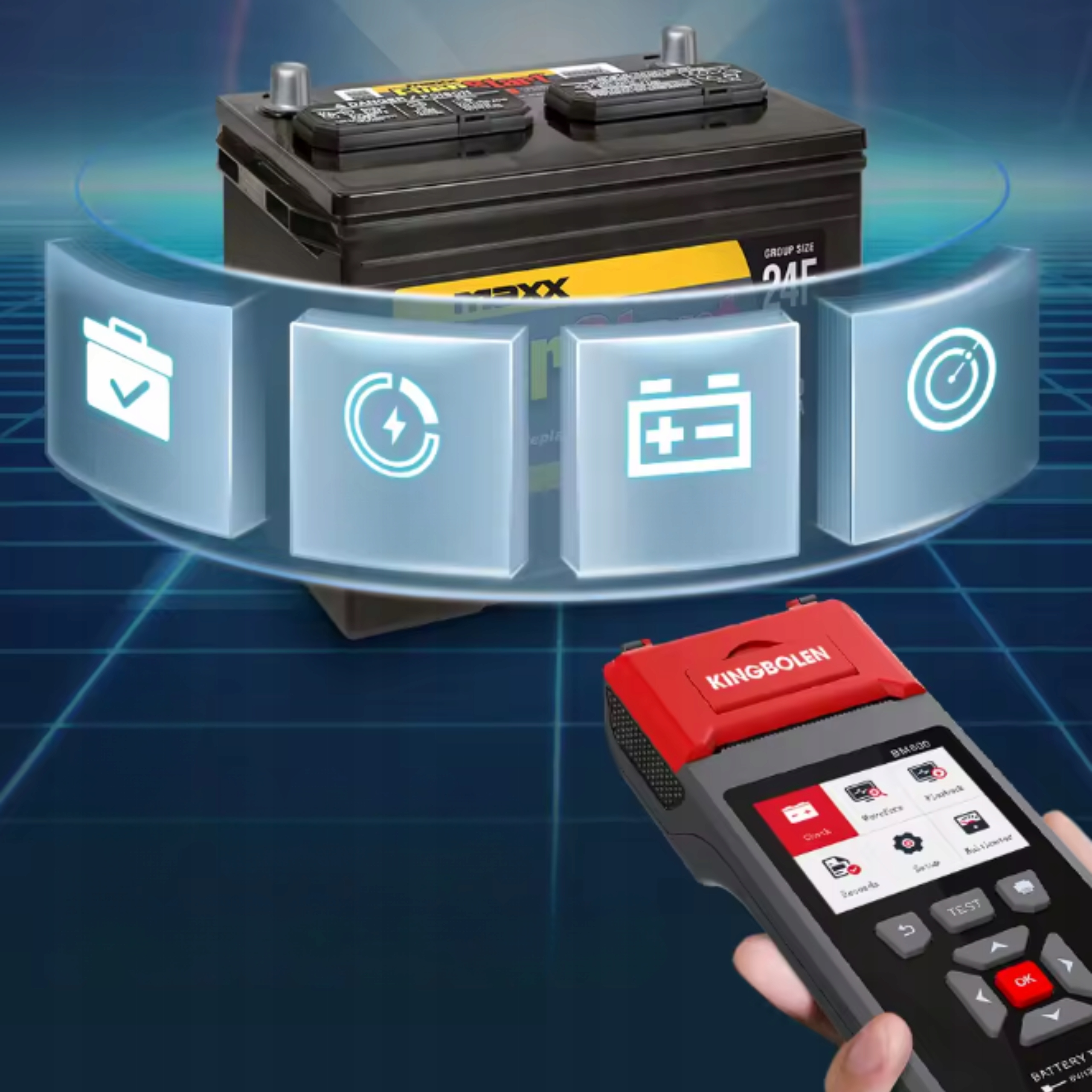 - Тест на зарядку - Перевірка напруги навантаження, без напруги навантаження, стан зарядки.