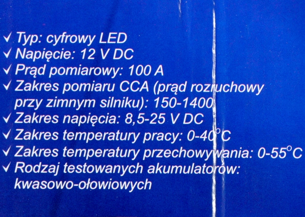 - Діапазон вимірювання CCA (струм запуску холодного двигуна): 150-1400 li >