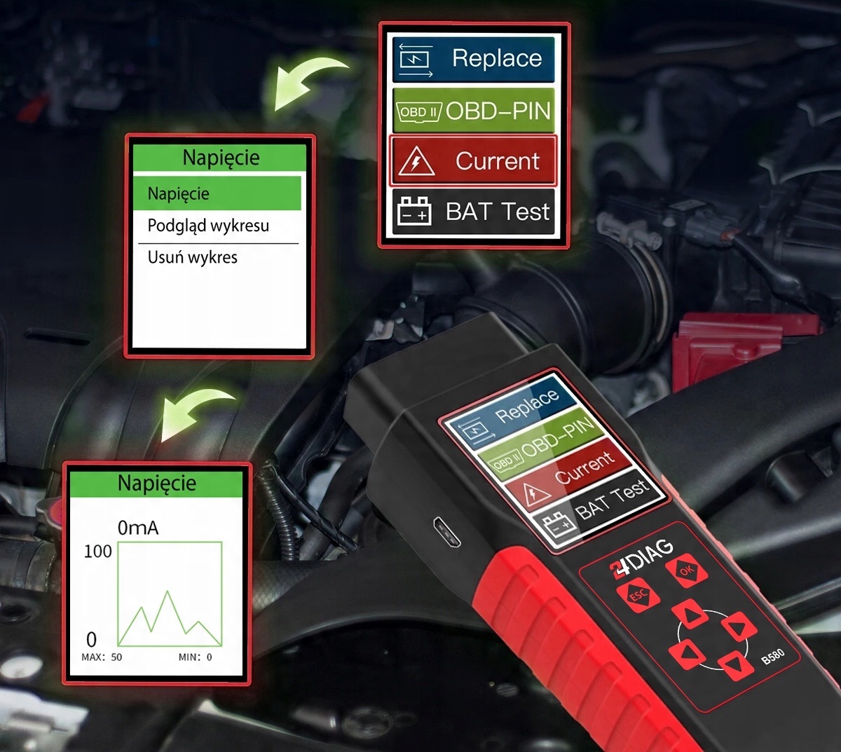 24Diag B580 -це версійне, багатофункціональне діагностичне інструмент для автомобілів. Використовуйте їх, щоб швидко замінити акумулятор транспортного засобу, підтримувати дані пам'яті ECU, витягування значень напруги з шпильок OBD2, виявлення поточних витоків та професійно аналізу стану акумулятора.