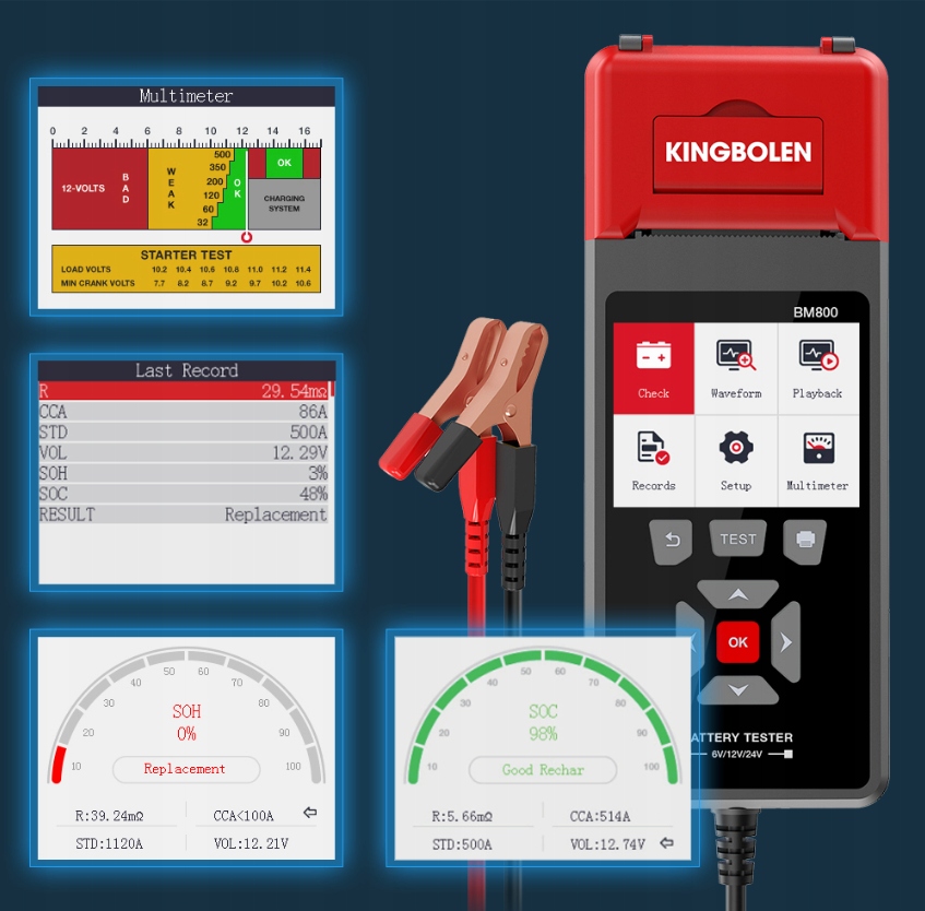 Тестер акумуляторів KINGBOLEN BM800 із принтером результатів вимірювань