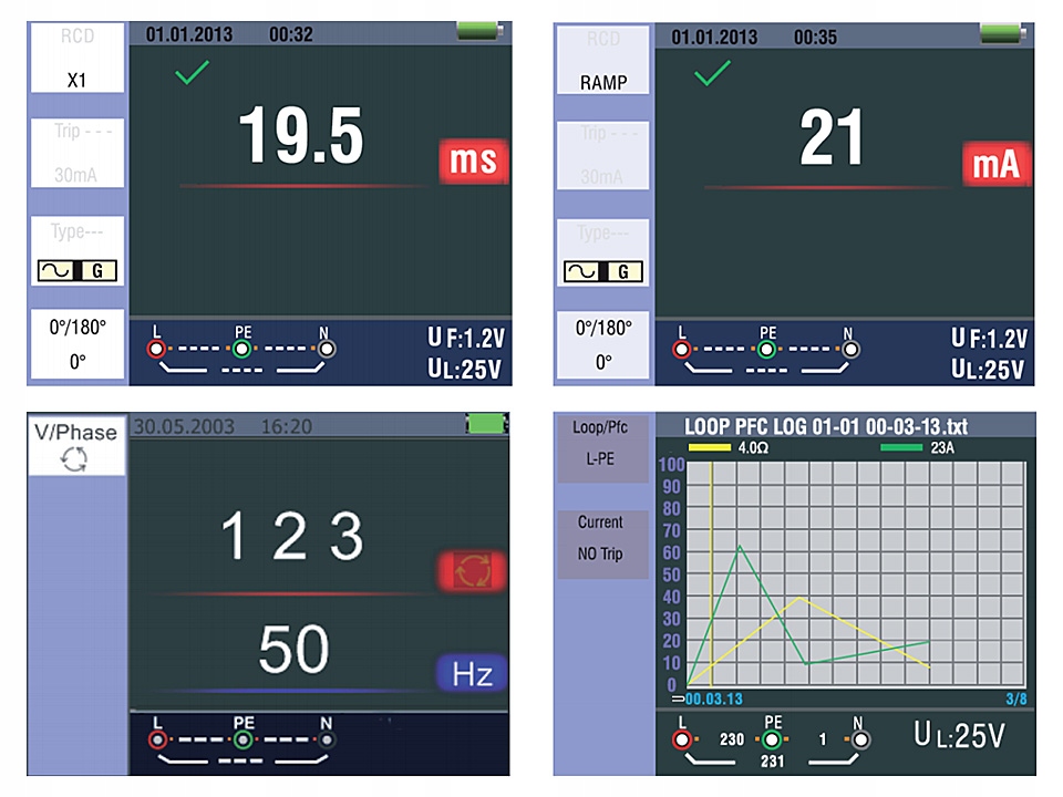 - Вимірювання опору контуру короткого замикання та прогнозованого струму замикання на землю (значення для L-PE, L-N і доступного струму короткого замикання PFC/PSC)