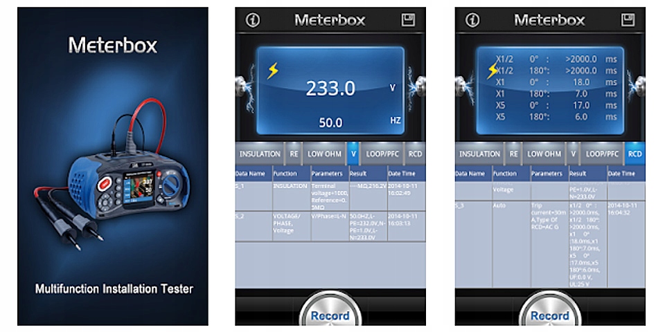 Тестер має можливість зберігати вимірювання на картці microSD (картка входить до комплекту) і з’єднуватися по Bluetooth із ПК/смартфоном/планшетом для читання та запису вимірювань. Пристрій поставляється з ключем USB-Bluetooth і програмним забезпеченням Meterbox для Win2000/XP/7/8/10 (програма Meterbox iMIT для смартфонів/планшетів Android/IOS доступна в GooglePlay і AppStore). Скріншоти програми нижче: