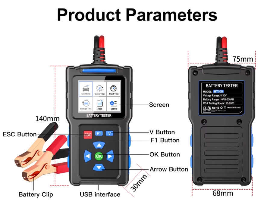 Відповідні типи акумуляторів: підходить як для автомобільних акумуляторів на 12 В, так і для 24 В, звичайних свинцево-кислотних акумуляторів, плоских акумуляторів AGM, акумуляторів AGM, гелевих акумуляторів, акумуляторів з високим вмістом рідини EFB тощо. Тестер акумуляторів підходить для типів транспортних засобів, зокрема: легкових автомобілів, вантажівок, автобусів, дизельних автомобілів, мотоциклів, човни, пляжні візки тощо.