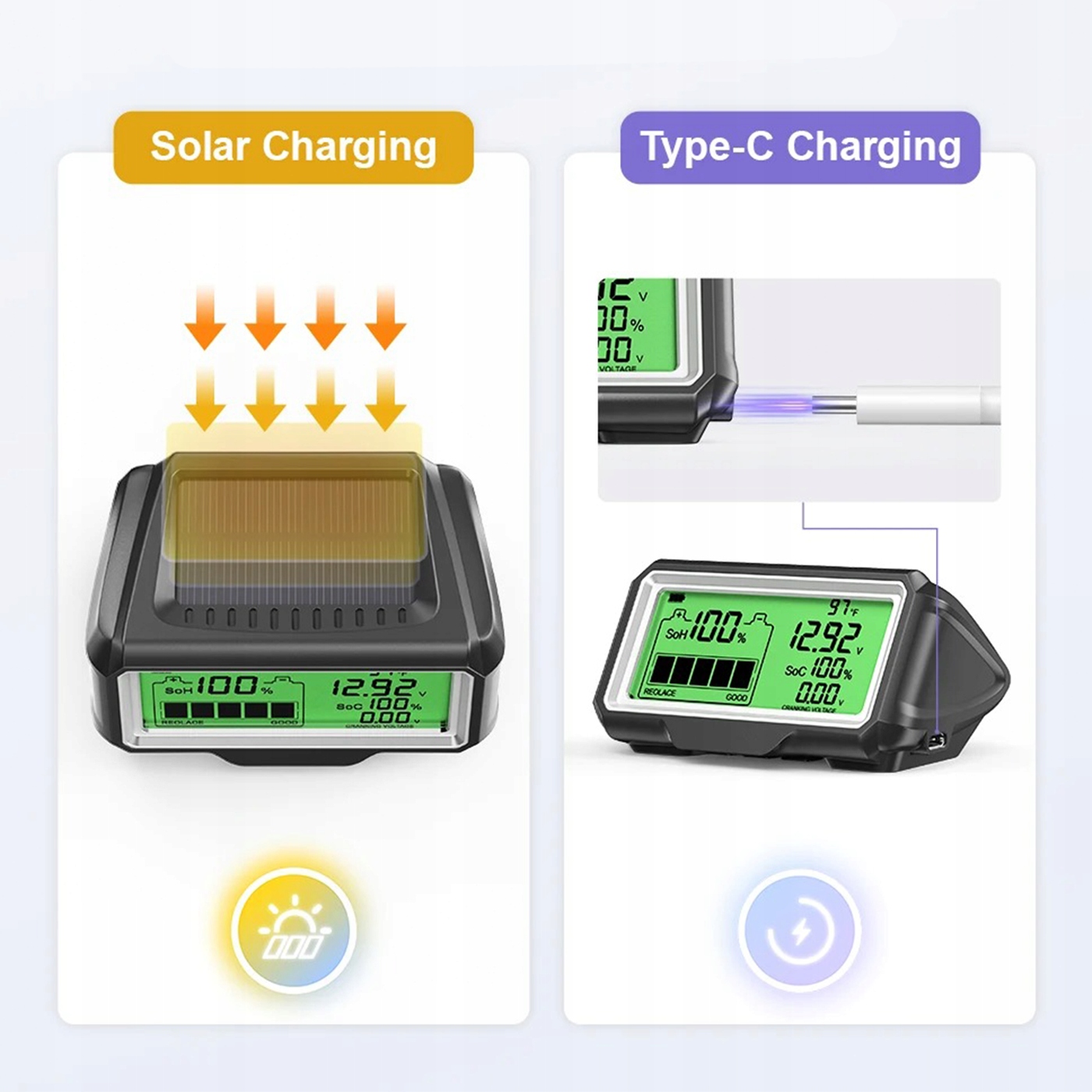 ⭐️ ІНТЕЛЕКТУАЛЬНИЙ тестер батареї 12 В 4 в 1 - монітор SOH/SOC, світлодіодний дисплей, зарядка від сонячної енергії та USB-C, водонепроникний аналізатор стану батареї - НЕОБХІДНА КЕРУВАННЯ БЕЗ ЗБОЇВ! ⭐️