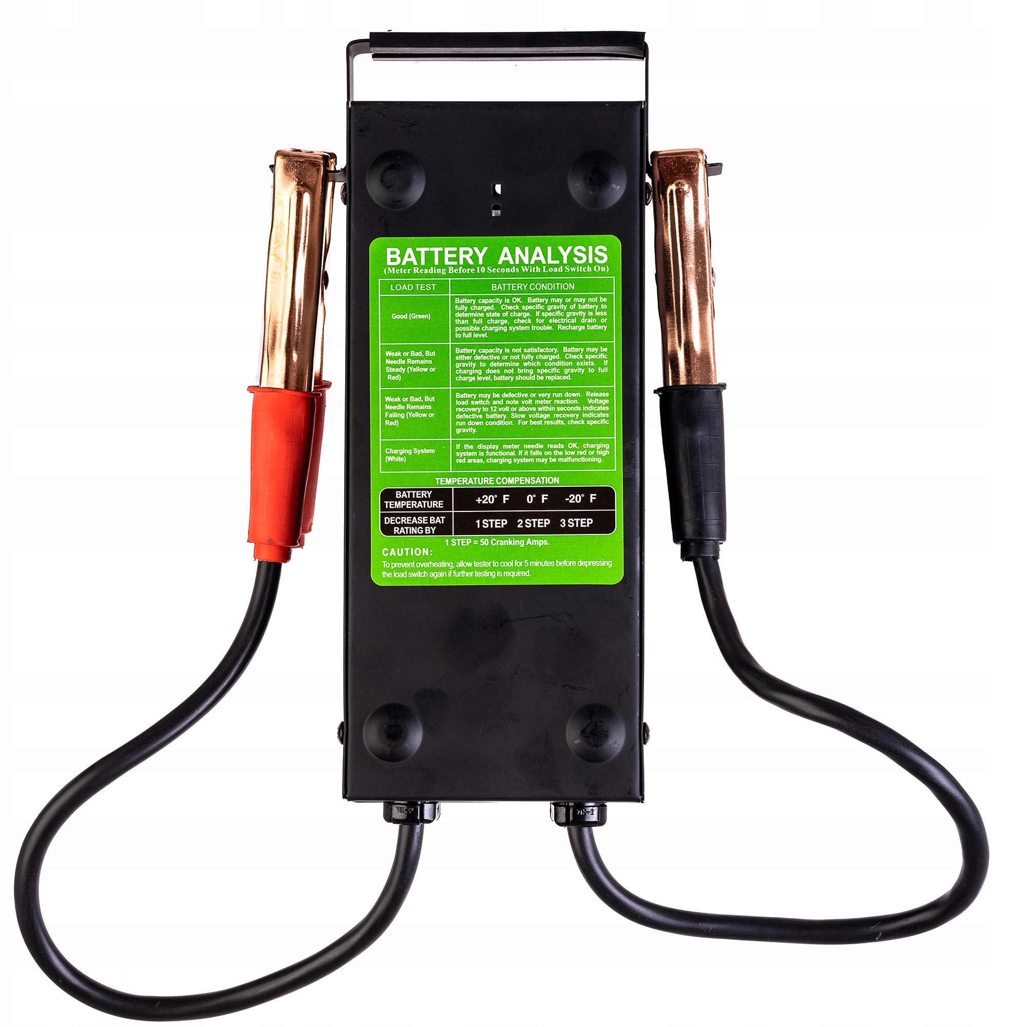 тестер, лічильник якості батареї автомобіля та моторних батарей . Вимірювання проводиться дуже просто, прикріплюючи крокодилів до клеїв автомобілів. Червоний крокодил для позитивного та чорного для негативного. Коли крокодили сильно містяться з акумуляторами з акумулятора, натисніть перемикач під індикатор. Наконечник вказує на відповідне поле жовтий, зелений або червоний . 4