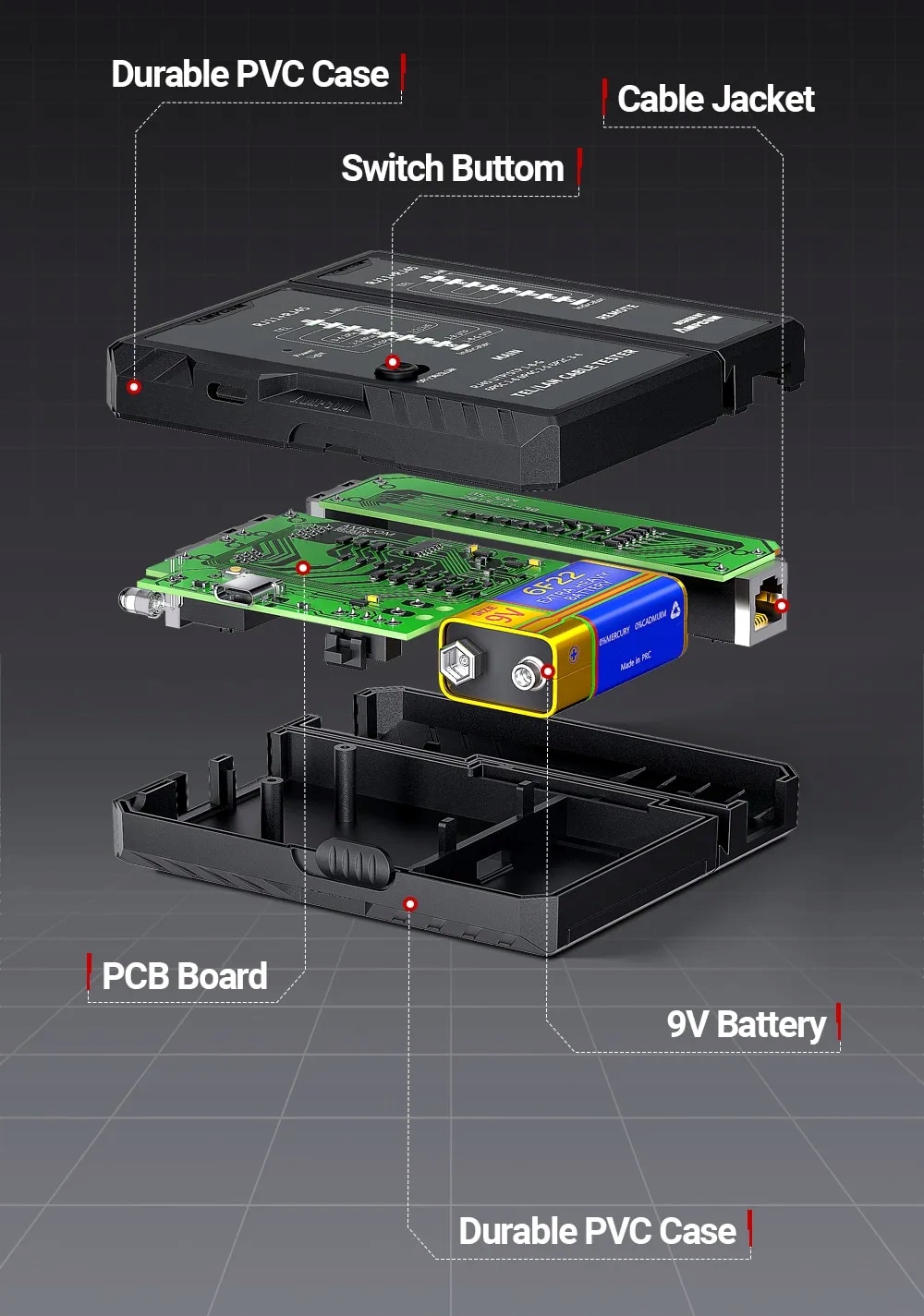 Тестує телефонні кабелі RJ11 / RJ12 / RJ14 і комп’ютерні кабелі RJ45 LAN щоб знайти проблеми з обривом кабелю, неправильним підключенням, перетином пар та іншими помилками проводки.