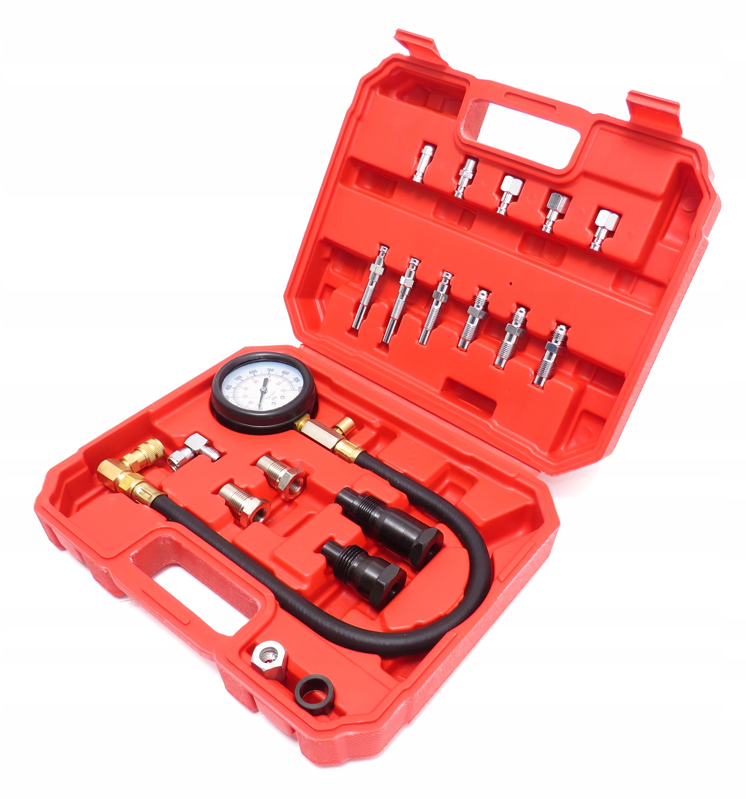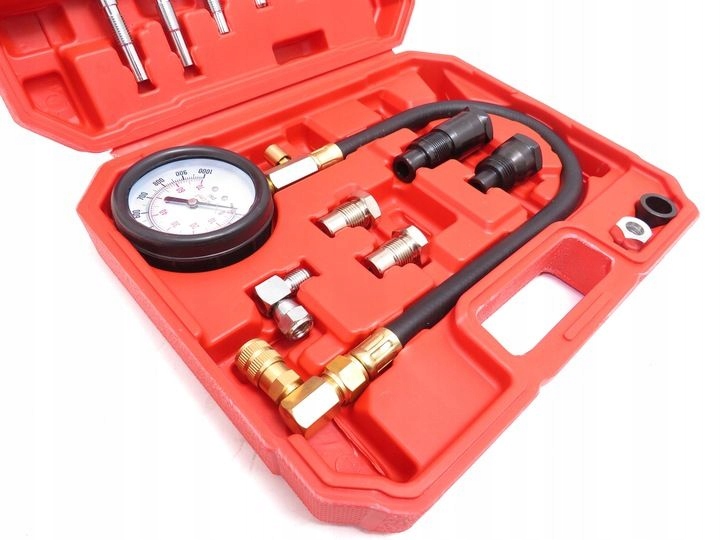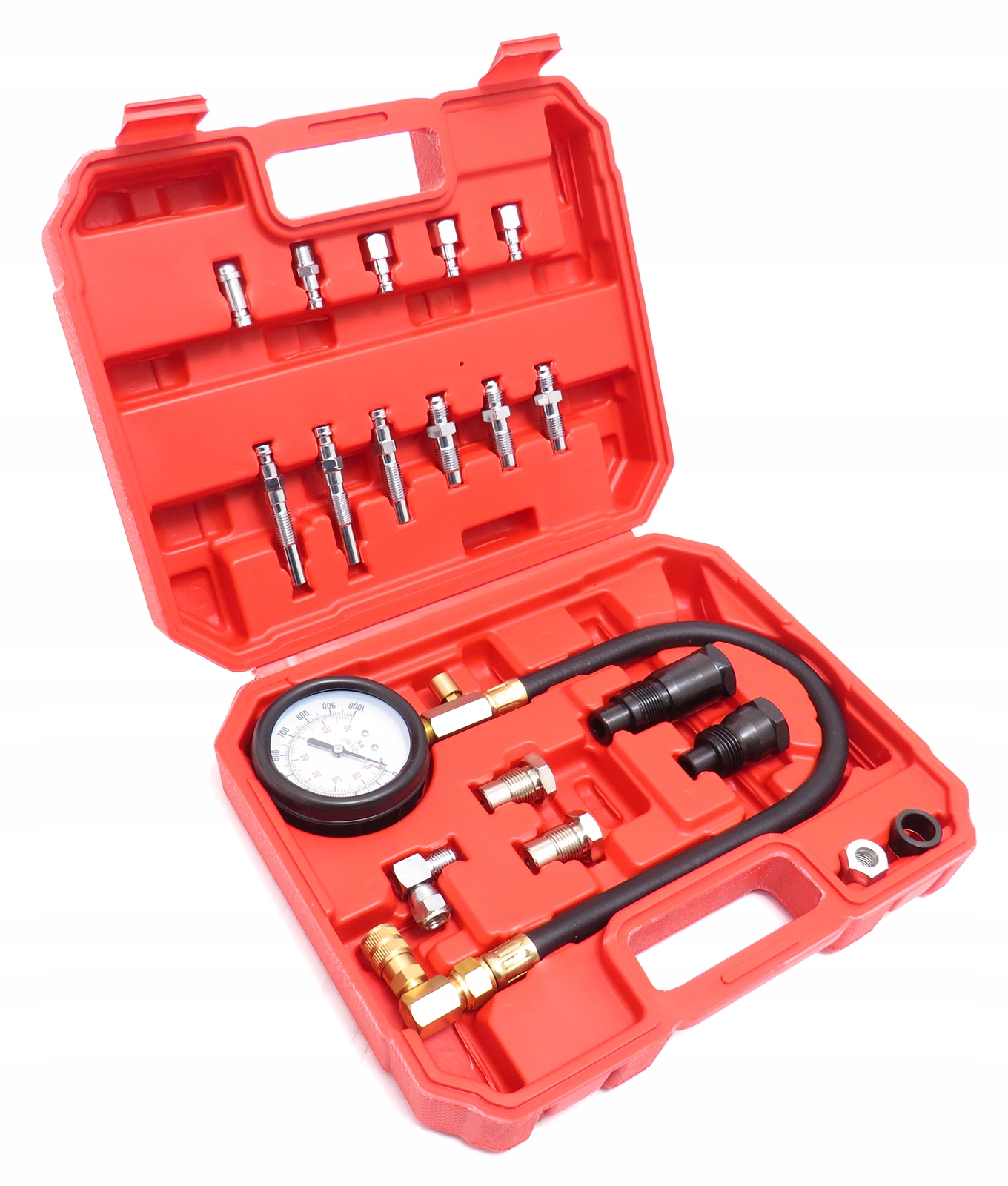 Манометр оснащений клапаном, який запобігає повороту стрілки назад після вимірювання. Клапан також використовується для очищення вимірювання. Набір міцно виготовлений і поміщений в естетичний чемодан.