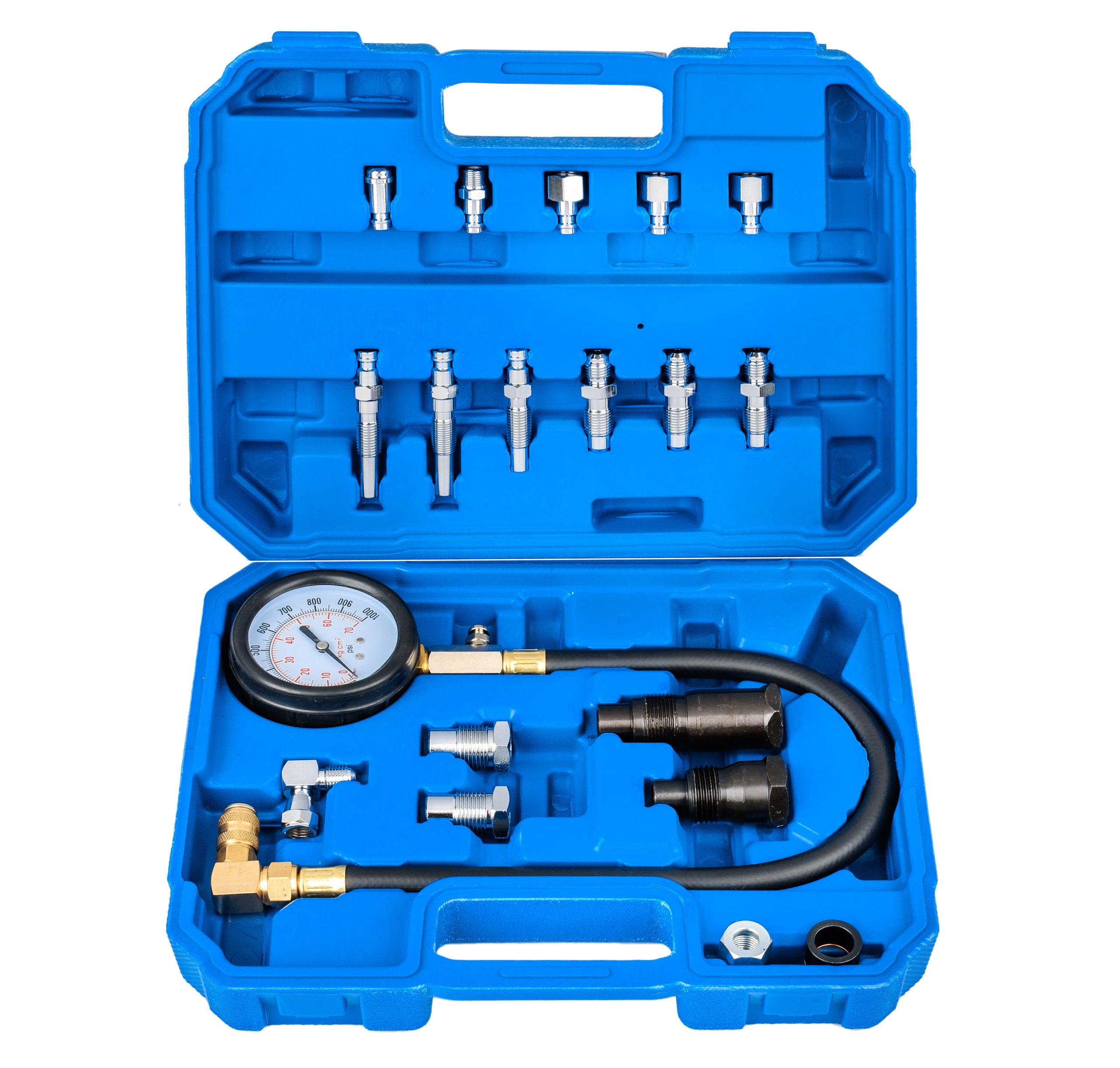 Професійний набір для вимірювання тиску стиснення в циліндрах дизельних двигунів. Вимірювання можна проводити як через свічки розжарювання, так і через інжектор.