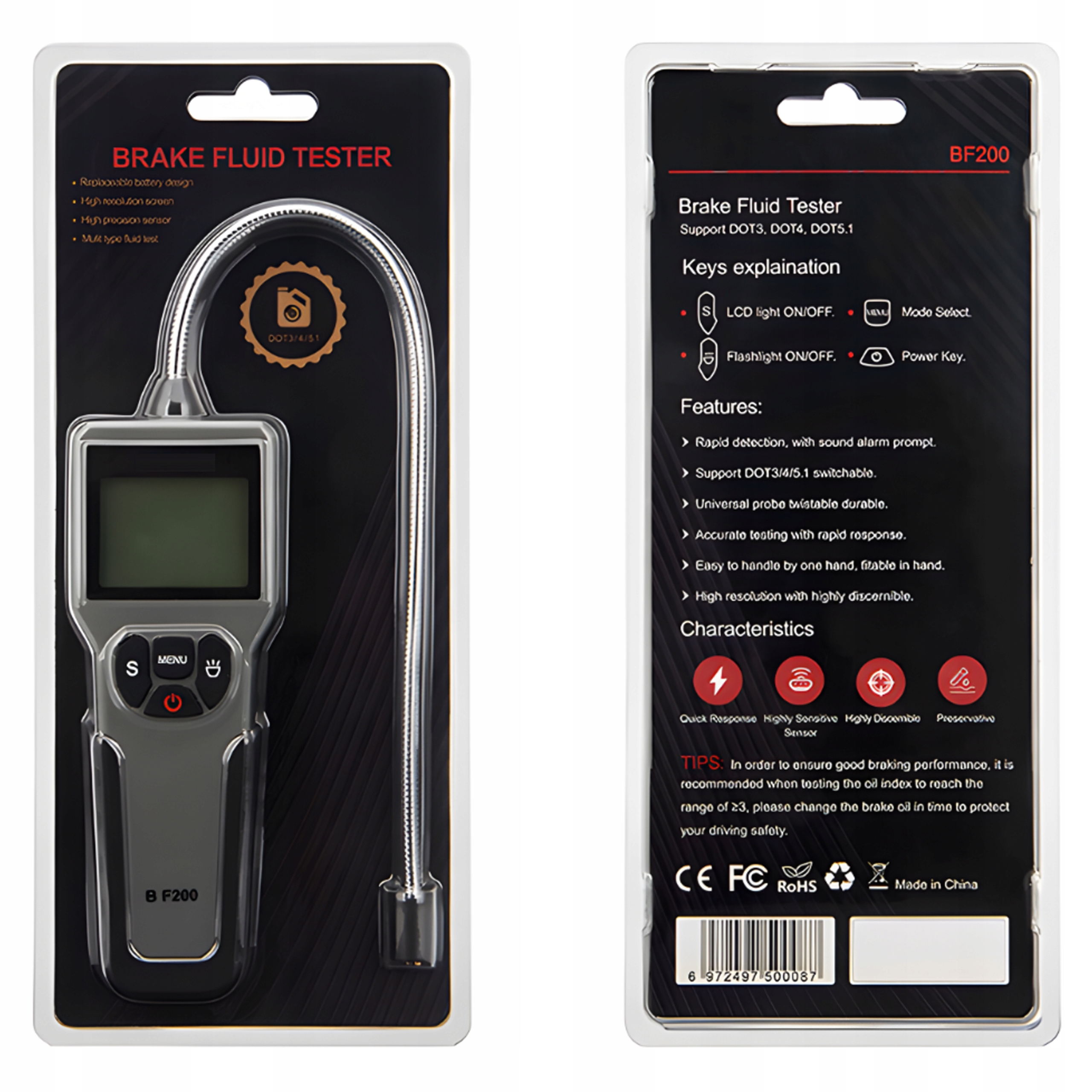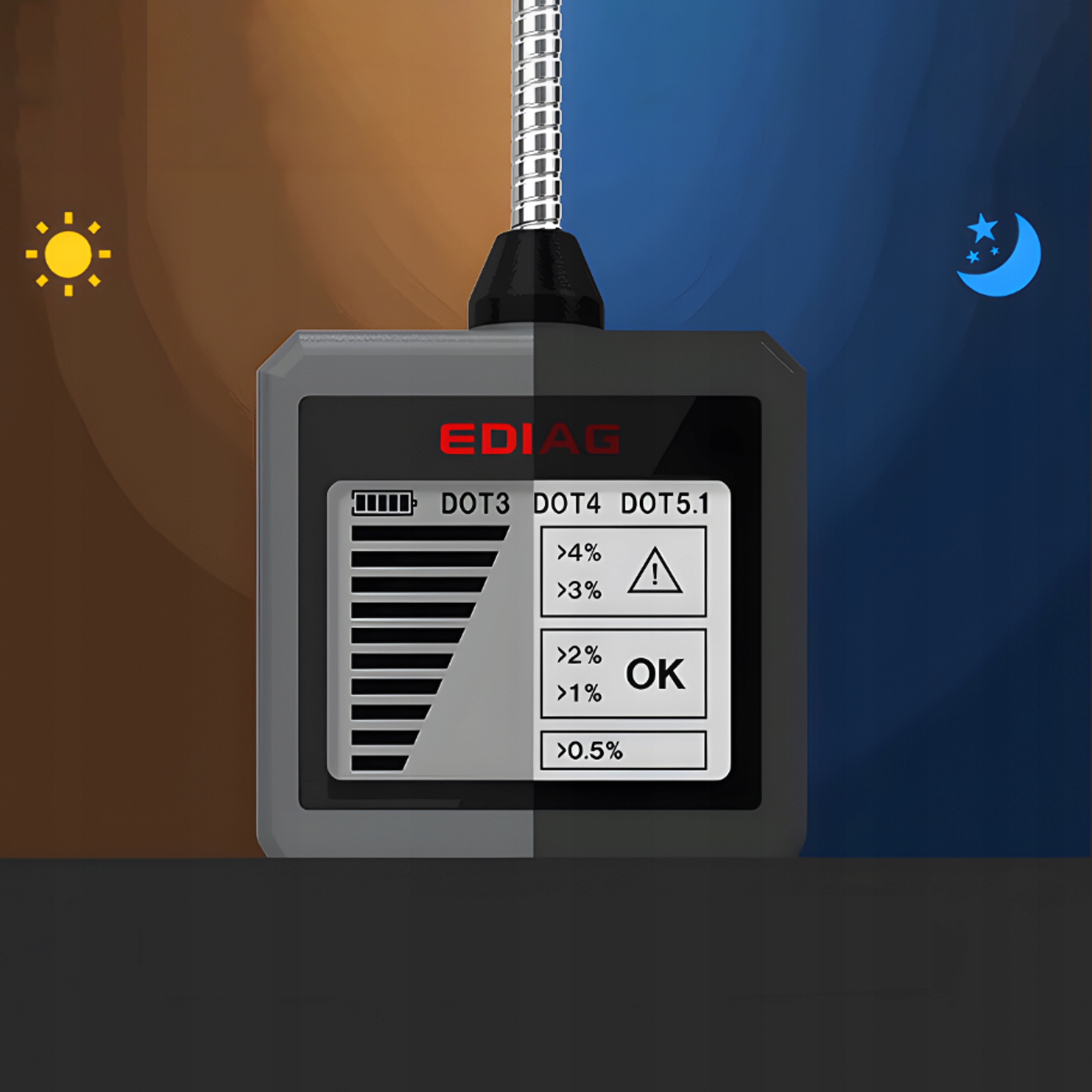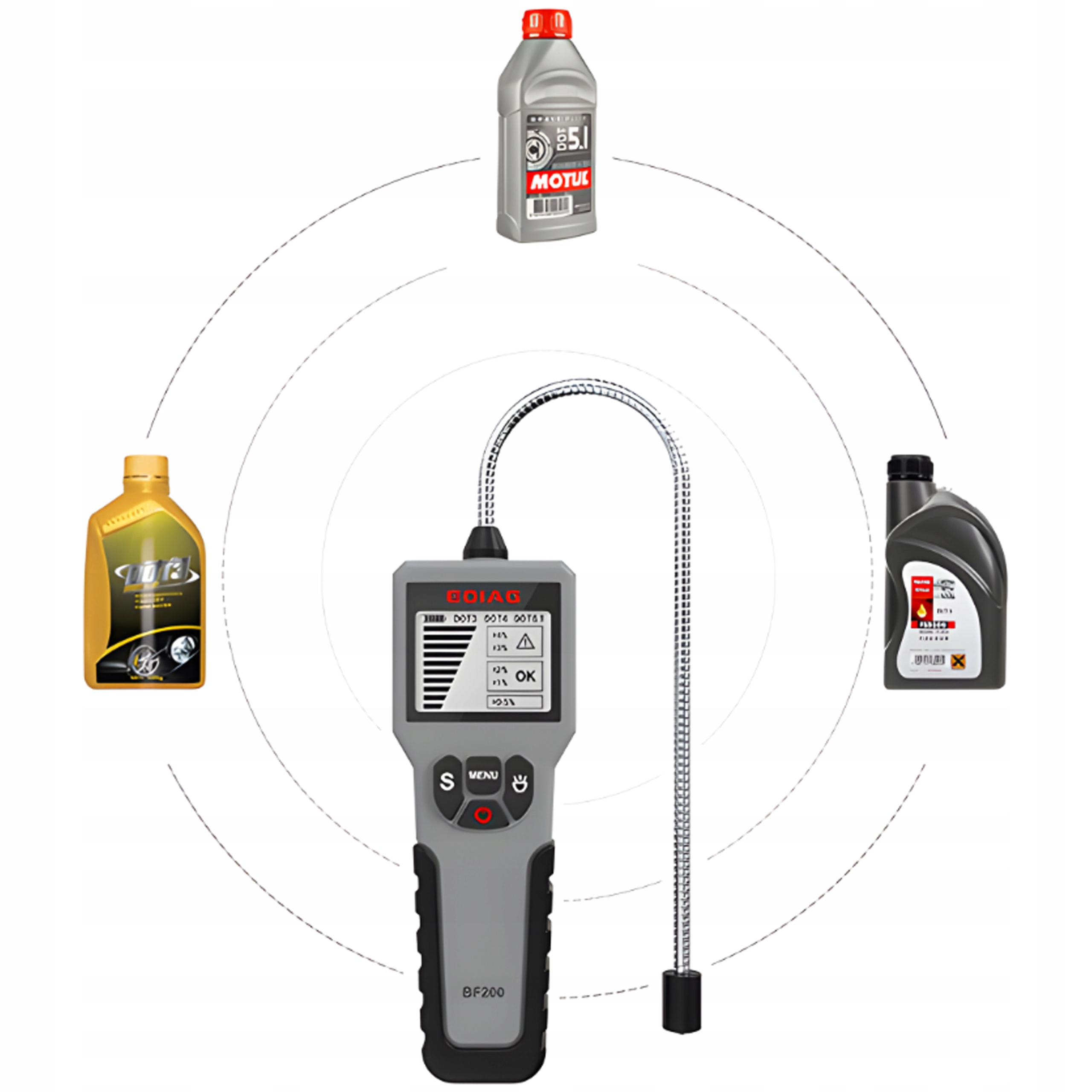 Цей професійний тестер гальмівної рідини розроблено для точності та швидкості визначення стану гальмівної рідини. Оснащений вдосконаленим, гнучким і надзвичайно чутливим зондом, він дозволяє миттєво і точно зчитувати показання. Зонд, який нагадує гусячу шию, забезпечує неперевершену гнучкість під час процесу виявлення, що робить всю процедуру набагато легшою та швидшою.