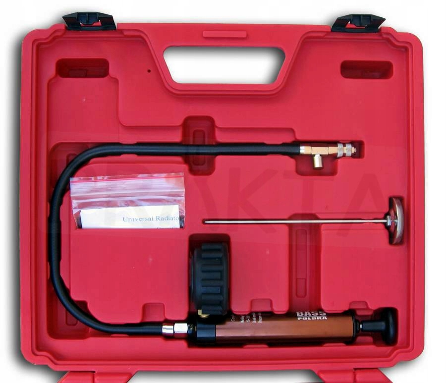Тестер використовується для виявлення витоків у системі охолодження. Міцний ручний насос із плавною роботою та зручною для читання шкалою манометра. У комплект також входить 12 перехідників для різних марок авто і термометр.