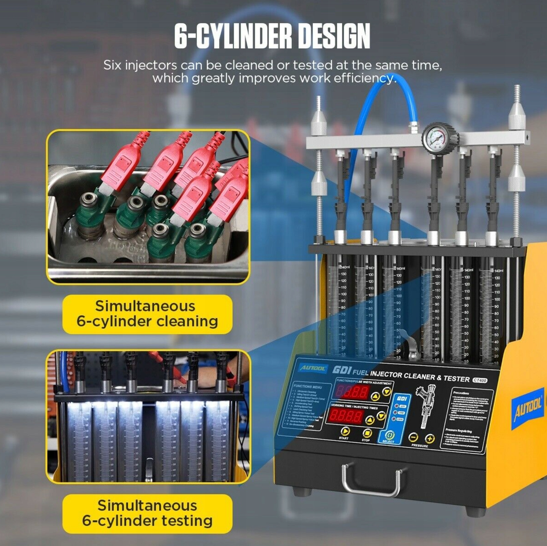 У зв’язку зі зростаючою зрілістю та використанням прямого вприскування бензину, у 2021 році AUTOOL випустила пристрій для очищення та перевірки форсунок CT400 GDI. Пряме впорскування бензину — це технологія, яка впорскує паливо безпосередньо в циліндр і змішує його з повітрям, що всмоктується. У порівнянні зі звичайними інжекторами використання GDI може допомогти підвищити ефективність двигуна та питому вихідну потужність, а також зменшити викиди вихлопних газів. CT400 не тільки підтримує GDI, EFI, FSI та інші типи паливних форсунок, але також сумісний зі стандартними паливними форсунками. CT400 доступний у трьох варіантах напруги для живлення форсунок GDI: 12 В, 70 В і 120 В, що в основному охоплює форсунки більшості марок автомобілів у Європі, Америці та Азії.
