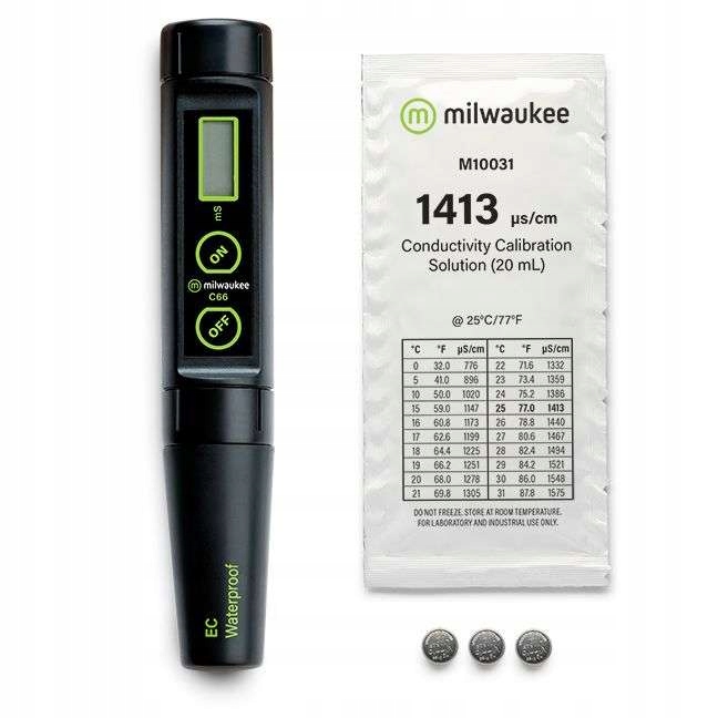Тестер провідності Milwaukee C66 TDS/EC - вимірювач провідності Водонепроникний тестер, призначений для всіх застосувань. Водонепроникний корпус і змінний зонд роблять його також придатним для застосування у важких умовах, наприклад для очищення стічних вод і сільського господарства. Модульна конструкція дозволяє легко замінити зонд і батарею. - водонепроникний - діапазон вимірювання: 0,00-10,00 мСм/см - точність: ±2% - температура комп.: автоматична - зразок: MA73076 (змінний) - калібрування: ручне - температура робочого середовища: 0-50°C - живлення: 3 x 1,5 В - термін служби батареї: приблизно 250 год - вага: 157 г - розміри: 254 x 67 x 47 мм - виробник: MILWAUKEE MAINTENANCE EC електроди можуть накопичувати поживні речовини з часом. Щоб мінімізувати накопичення, завжди промивайте зонд свіжою водопровідною водою після кожного використання.ПЕРЕТВОРЕННЯ ПОКАЗНИКІВ ZEC У TDS Тестер провідності Milwaukee PRO, як і всі кондуктометри, забезпечує вимірювання електрично заряджених іонів у розчині та є абсолютним показником У гідропоніці EC часто перетворюють на TDS у частках на мільйон (ppm).