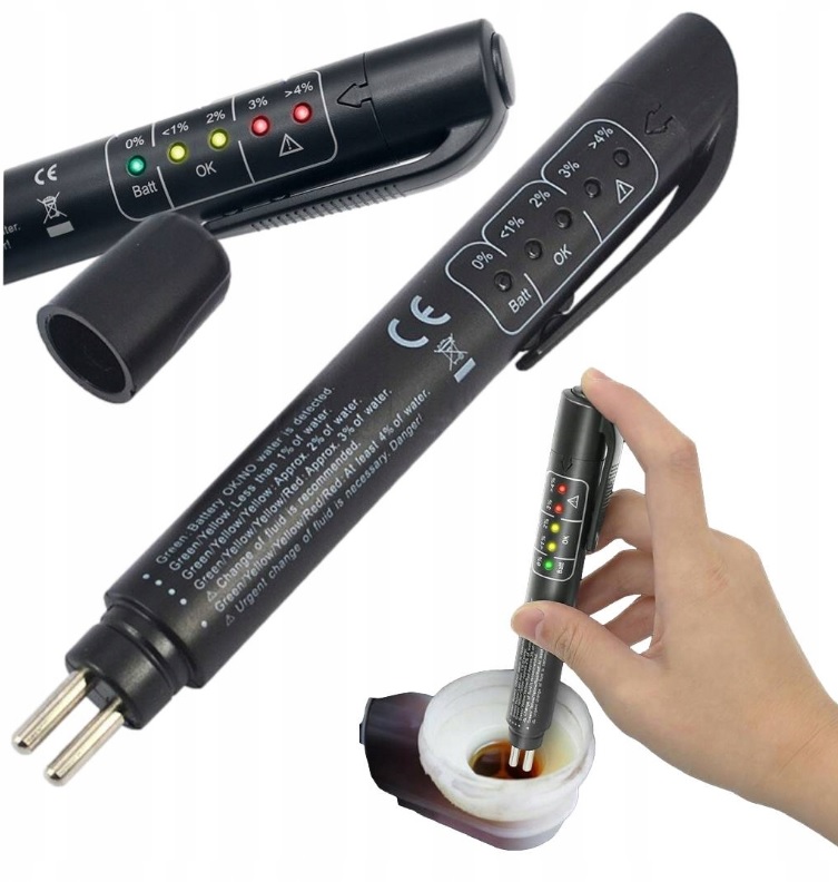 Тестер вимірює відсоток води в гальмівній рідині. Гальмівна рідина не повинна містити більше 2% води.