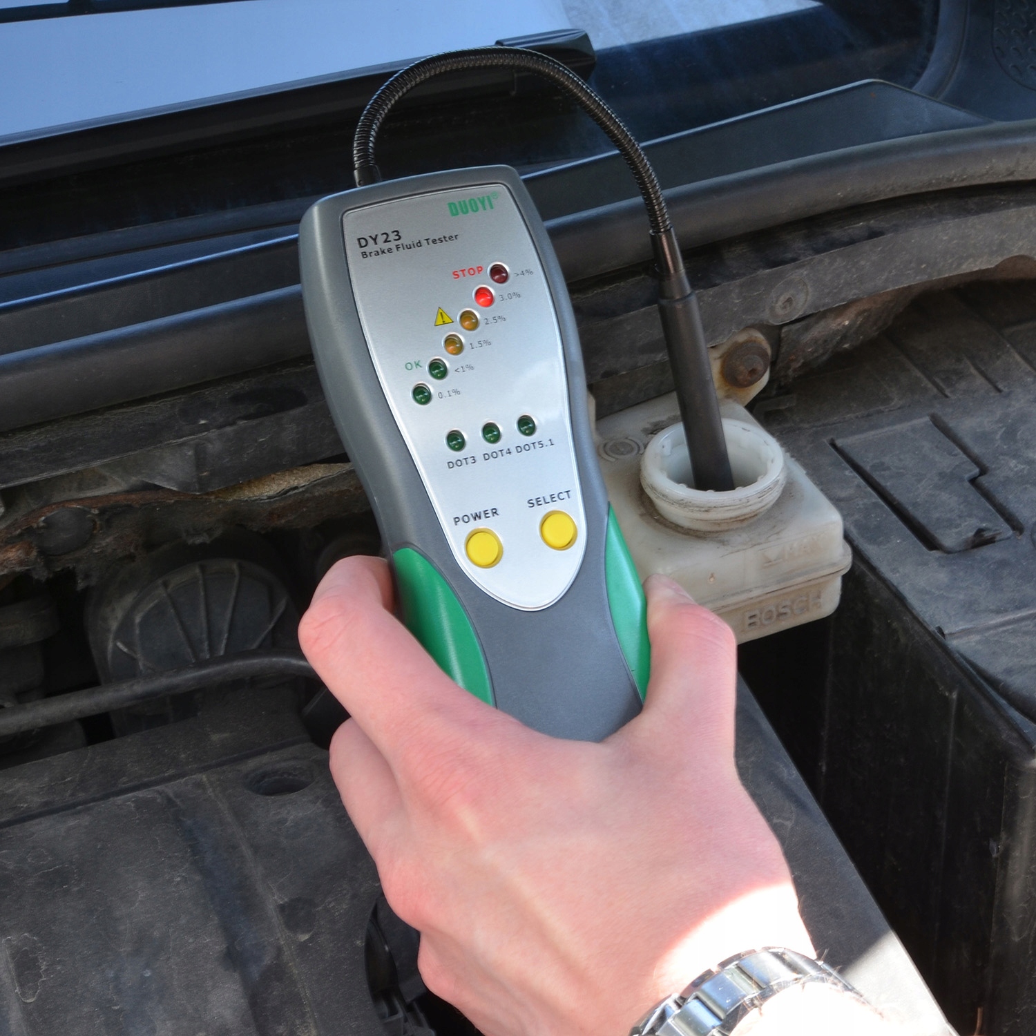 dy23 Це дозволяє перевіряти вміст води гальмівної рідини з точністю 1 %. Кишенькова форма та джерело живлення з однією акумулятором 9 В роблять його вміст у сервісній сумці і готовий працювати, коли вам потрібно працювати.