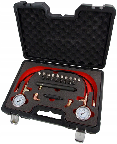 Тестер дозволяє одночасно перевіряти гальмівну систему передніх і задніх коліс, щоб встановити однаковий тиск. Високоякісні манометри, заповнені гліцерином. У комплект входить набір адаптерів. Все запаковано у валізу.
